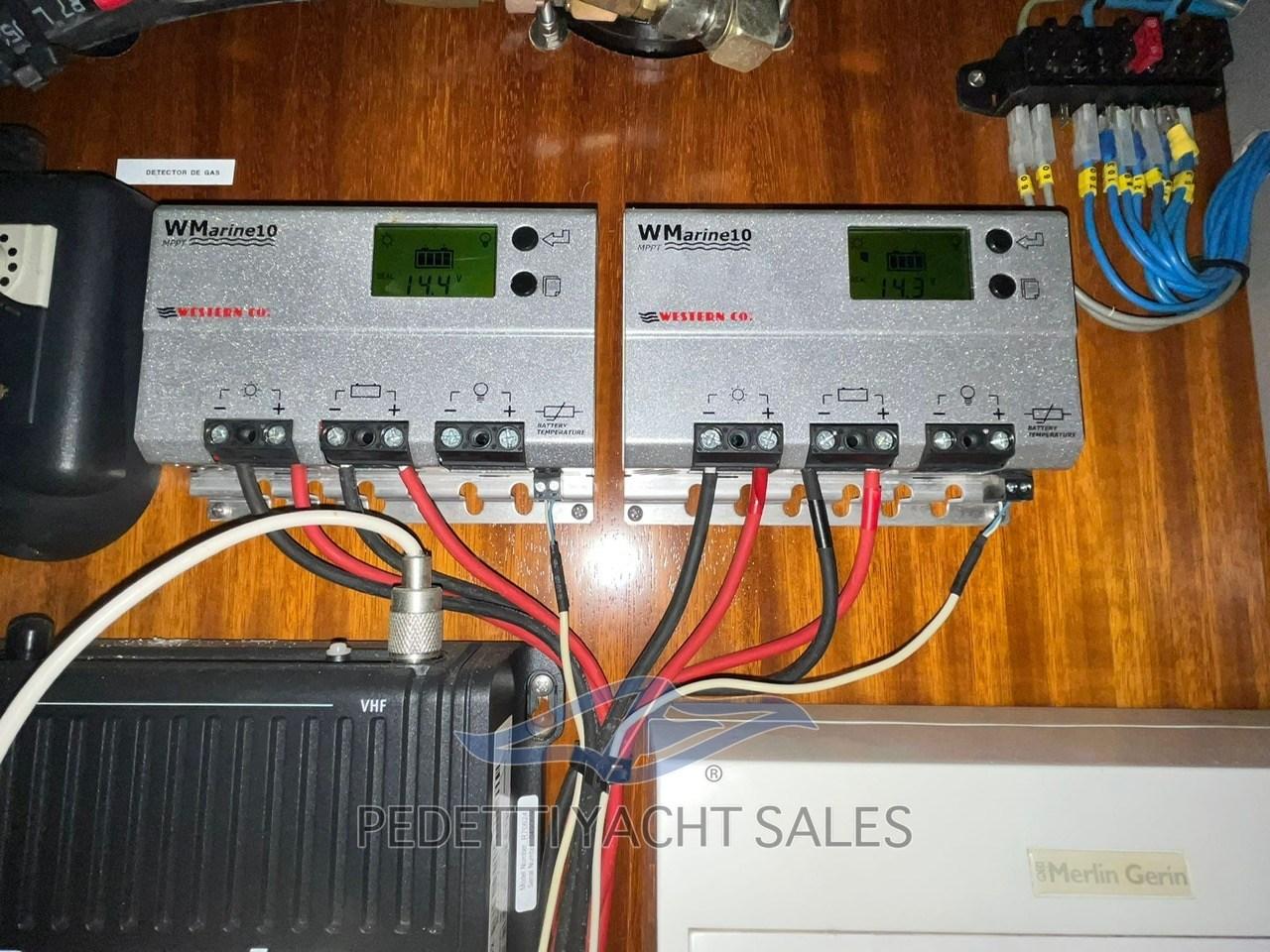 Raymarine GPS/plotter electronics, ECO, VHF, autopilot, bow thruster, solid teak deck, new FUSION MS-RA770 stereo system, dual charger, solar panels with control screen, oversized stainless steel headlight, chain and anchor.