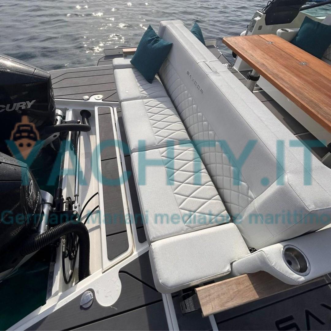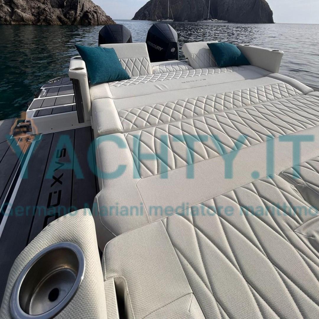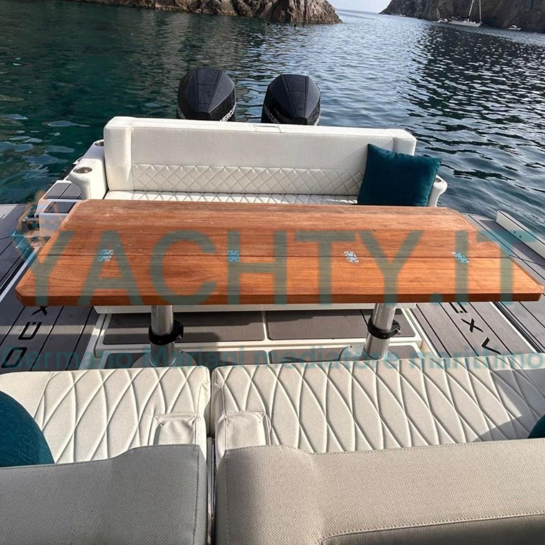 Bimini (tendalino con pali in carbonio a poppa), Cushions, Stern Cushions (divani trasformabili in prendisole a poppa), Bow Cushions, Cockpit Cushions, Mattresses.
