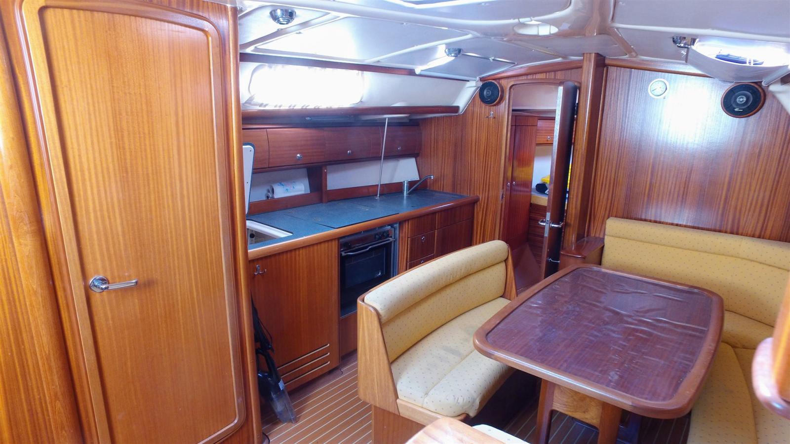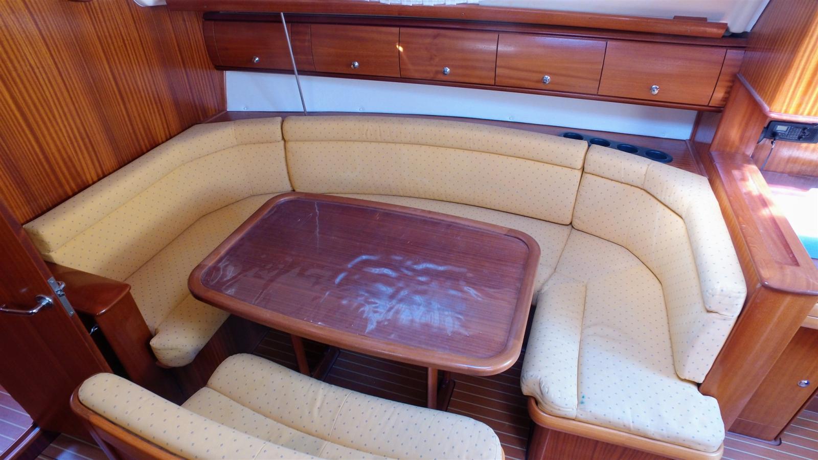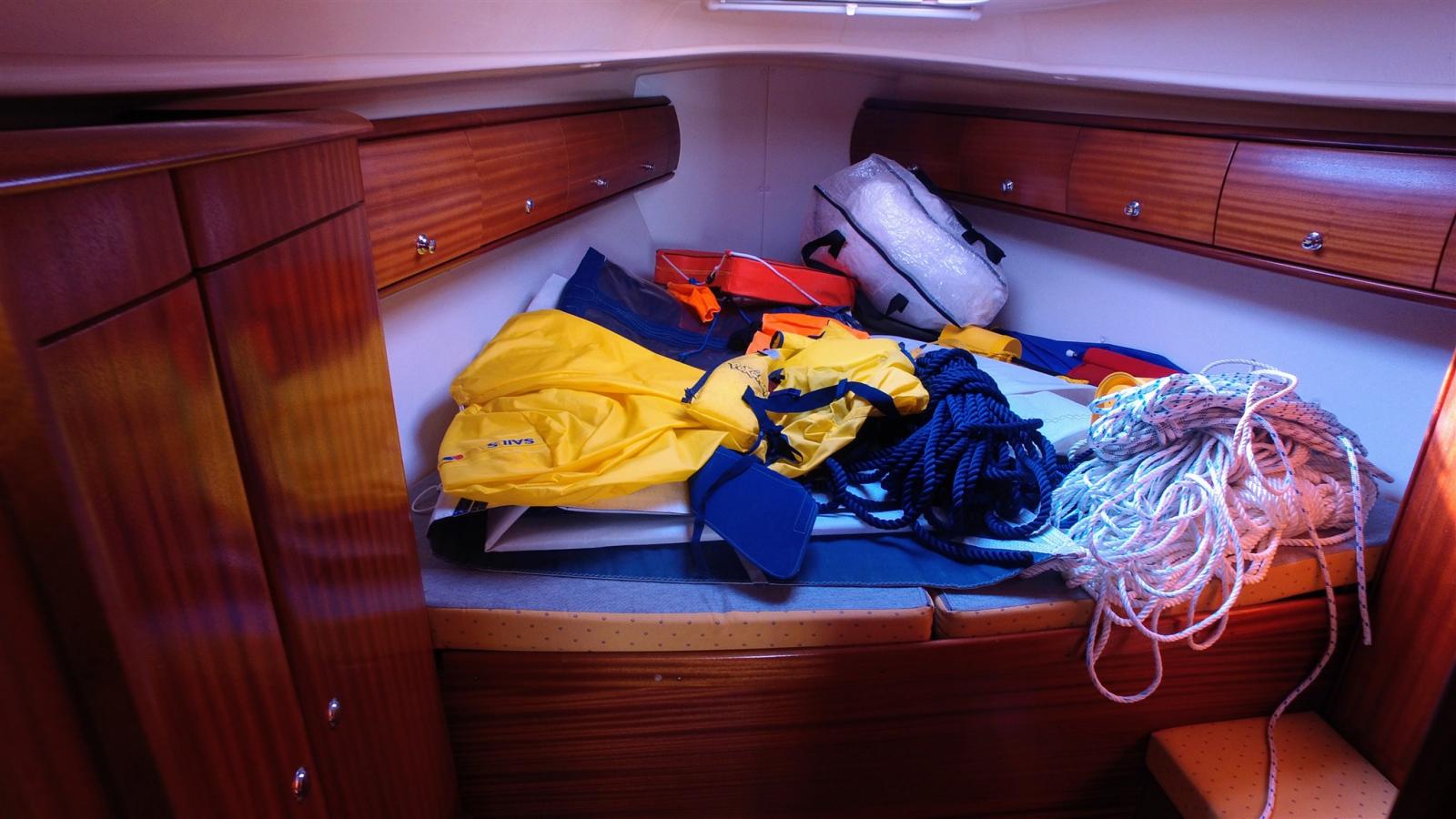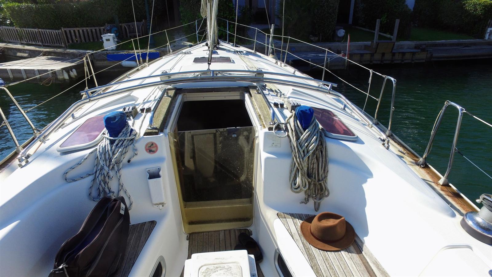 Engine Alarm, Alternator, Anchor (15 KG), 4 Selftailing winch, Water pressure pump, 3 Batteries (2 services de 140 amp et une moteur), Battery charger (Quick 30 amp), Shore power cable, Deck Shower, Bow Thruster (avec batterie), Manual Bilge Pump, Shorepower connector, Electronic instrumentation repeater (Raymarine ST60 tridata sur table à carte), Electric Windlass (1000 W), Strand rigging, swimming ladder, Outboard Engine Support Bracket (et Support BIP), cockpit table, 2 guard rails with gates.