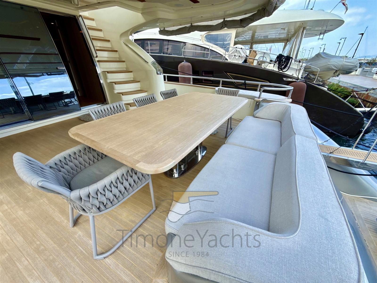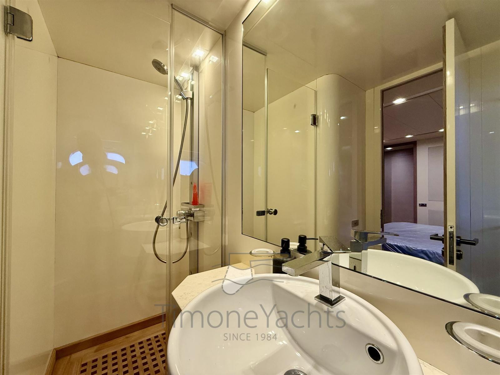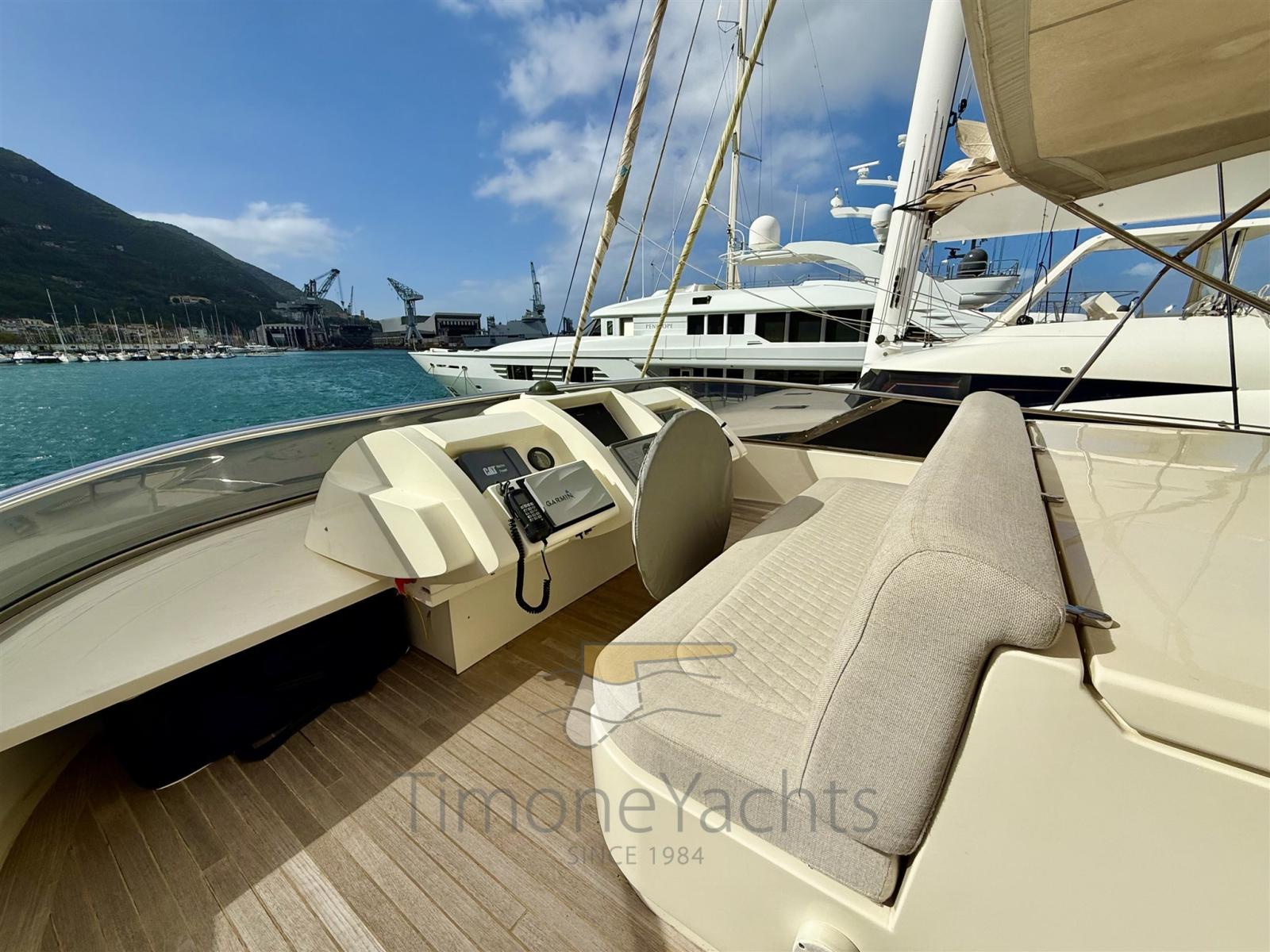 Alternator, Water pressure pump, Teak Side Decks, Special Colour, Guard rail, Deck Shower, Twin Steering, Hydraulic Flaps, Tender Garage, Tender Crane, Anchor Chain Washdown, 2 Washbasin in the cockpit, Courtesy Lights, Underwater lights, Gangway, Teak deck, Entry door, 2 Side door, Teak Cockpit, Shorepower connector, Water harbor connector system, Hydraulic Windlass, swimming ladder, Saddles for tender, Stabilizers (Seakeeper), cockpit table, Tender (Sur marine Yamaha 40 Cv), Horn, Stern Winches, Bow Winches.