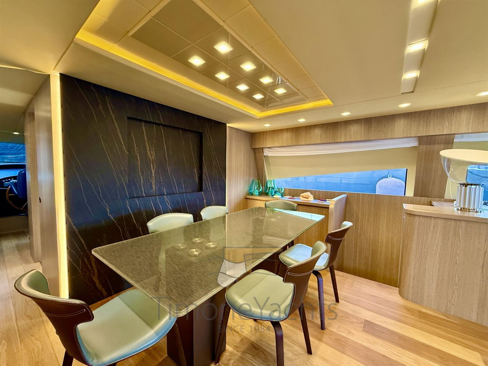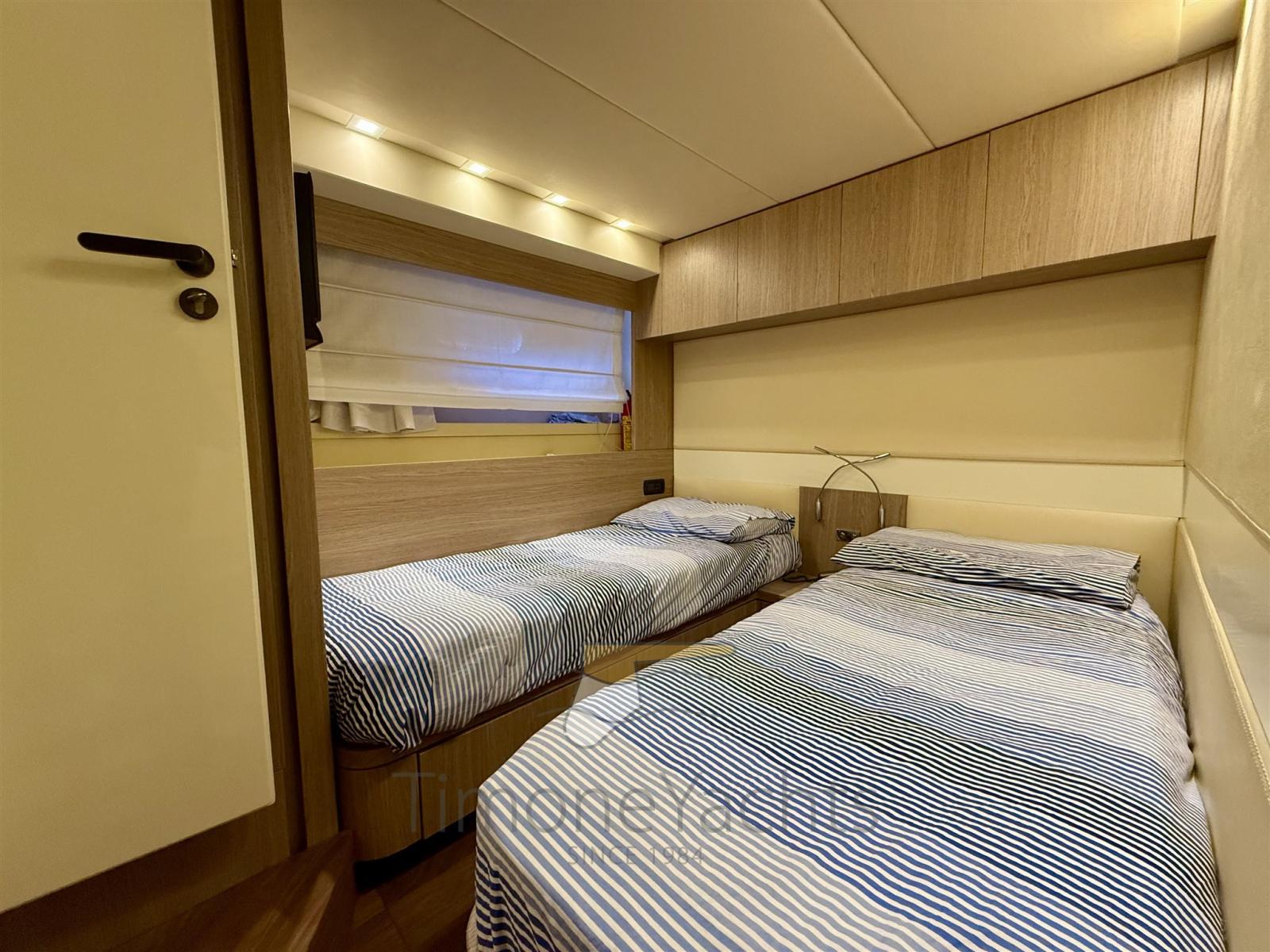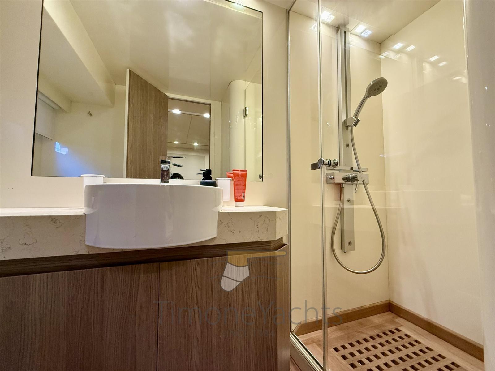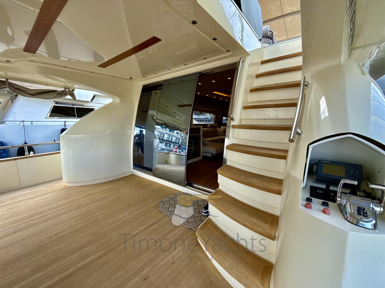 Alternator, Water pressure pump, Teak Side Decks, Special Colour, Guard rail, Deck Shower, Twin Steering, Hydraulic Flaps, Tender Garage, Tender Crane, Anchor Chain Washdown, 2 Washbasin in the cockpit, Courtesy Lights, Underwater lights, Gangway, Teak deck, Entry door, 2 Side door, Teak Cockpit, Shorepower connector, Water harbor connector system, Hydraulic Windlass, swimming ladder, Saddles for tender, Stabilizers (Seakeeper), cockpit table, Tender (Sur marine Yamaha 40 Cv), Horn, Stern Winches, Bow Winches.