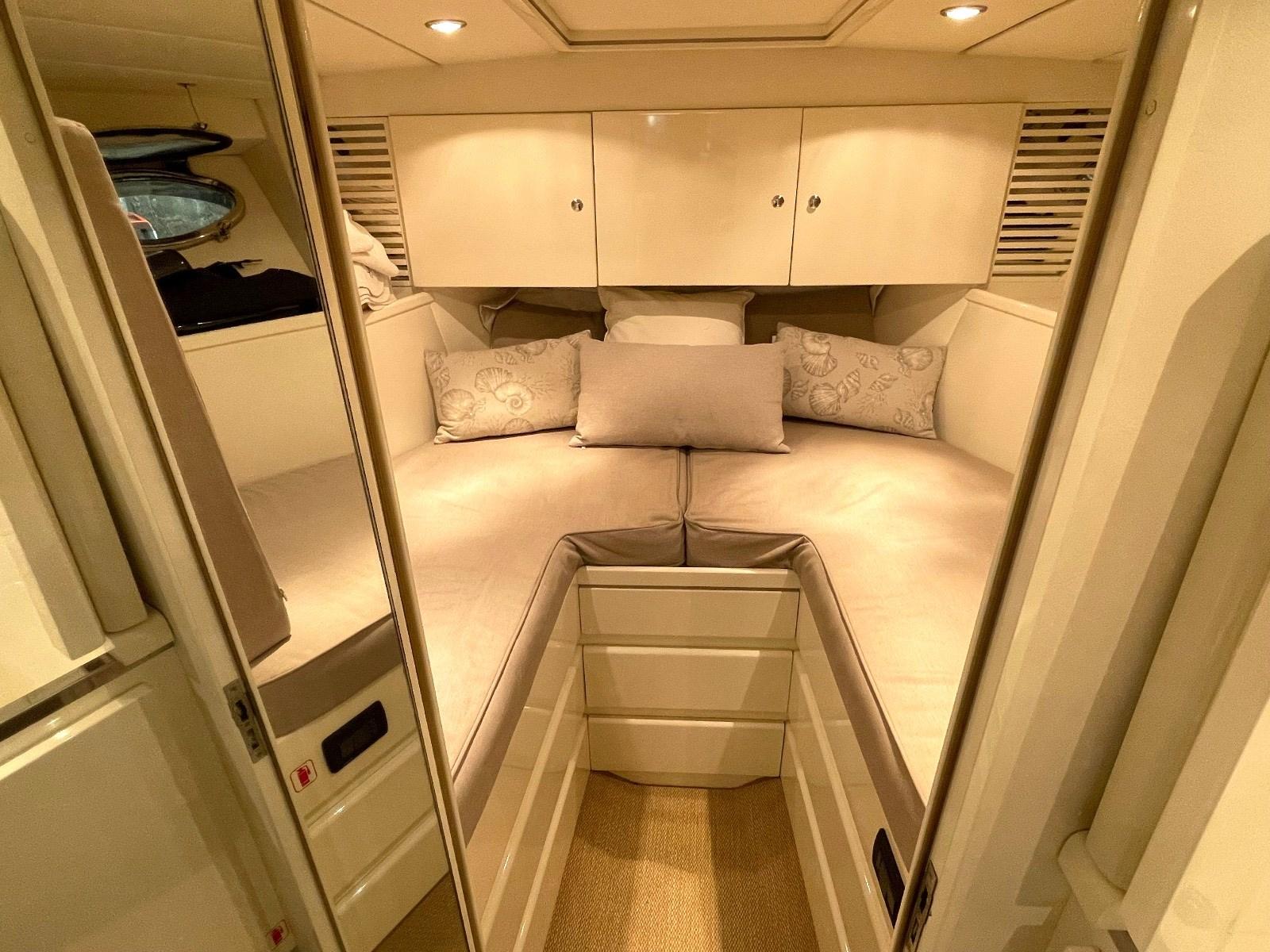 Master cabin with V-shaped double bed - convertible dinette - sofa convertible into a bunk bed - bathroom.