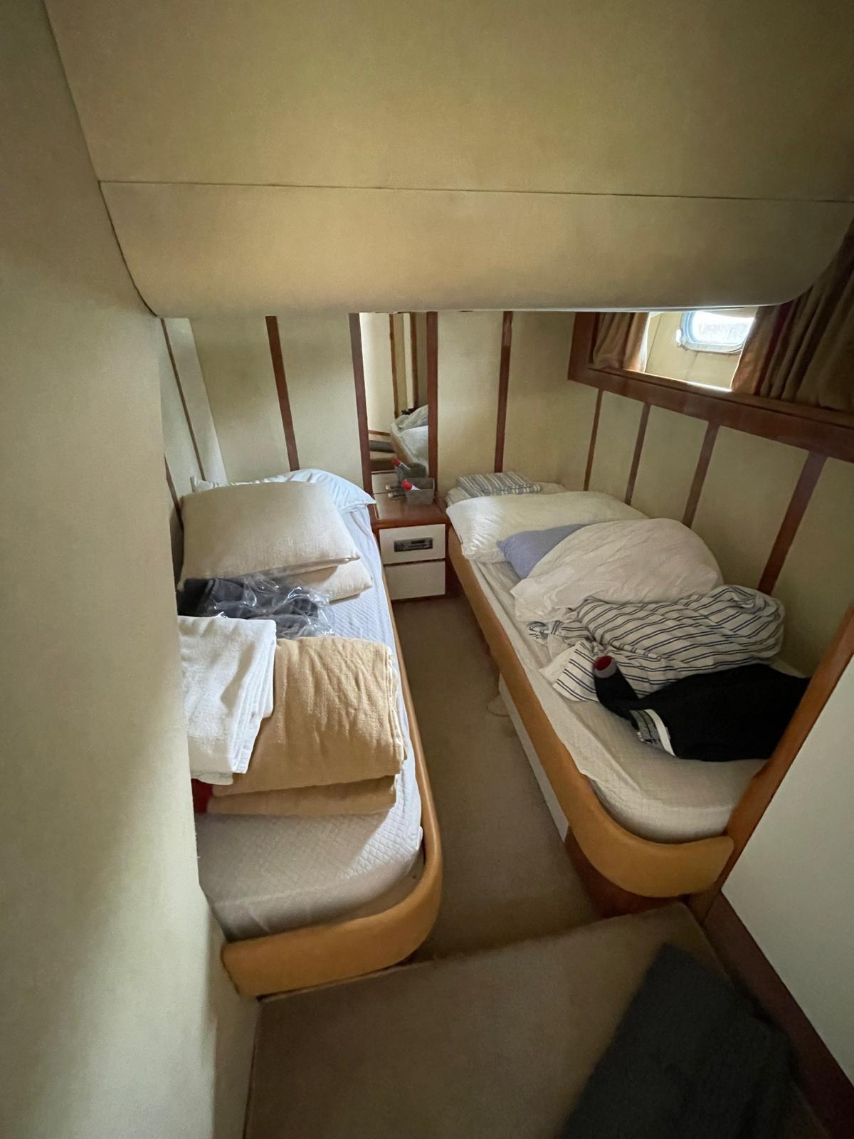 Master cabin with double bed and bathroom - guest cabin with French bed - guest cabin with two beds on the floor - guest bathroom.