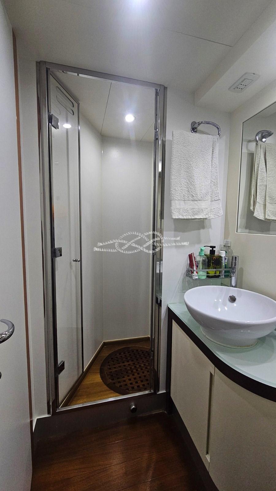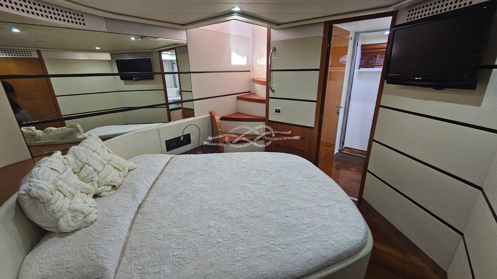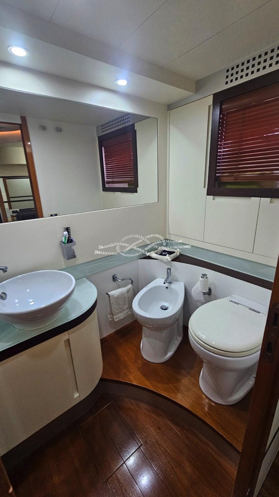 Condaria air conditioning with two additional compressors for the upper salon - Kohler 20 kW generator set (600 hours m.) - SAT TV antenna - LCD TV in all rooms - stern and engine room cameras (x 4) - Idromar watermaker - Bose sound system - bow thruster - stern thruster - tender garage - aft sofa convertible into sundeck - retractable electro-hydraulic gangway - double aft mooring winch - cockpit bar cabinet with sink - hob 4-burner induction - fridge - freezer - cockpit fridge in the dinette - microwave - dishwasher - electric blackout curtains in all rooms - leather sofas and control armchair - two Mastervolt service chargers - two Mastervolt motor chargers - two Mastervolt inverters - two fresh water autoclaves - black and grey water buffer pump - air flow and power regulation unit in the engine room - emergency device for trims - two shore sockets - direct water connection - underwater lights - backlit steel stern lettering - courtesy lights side walkways - SAT telephone.