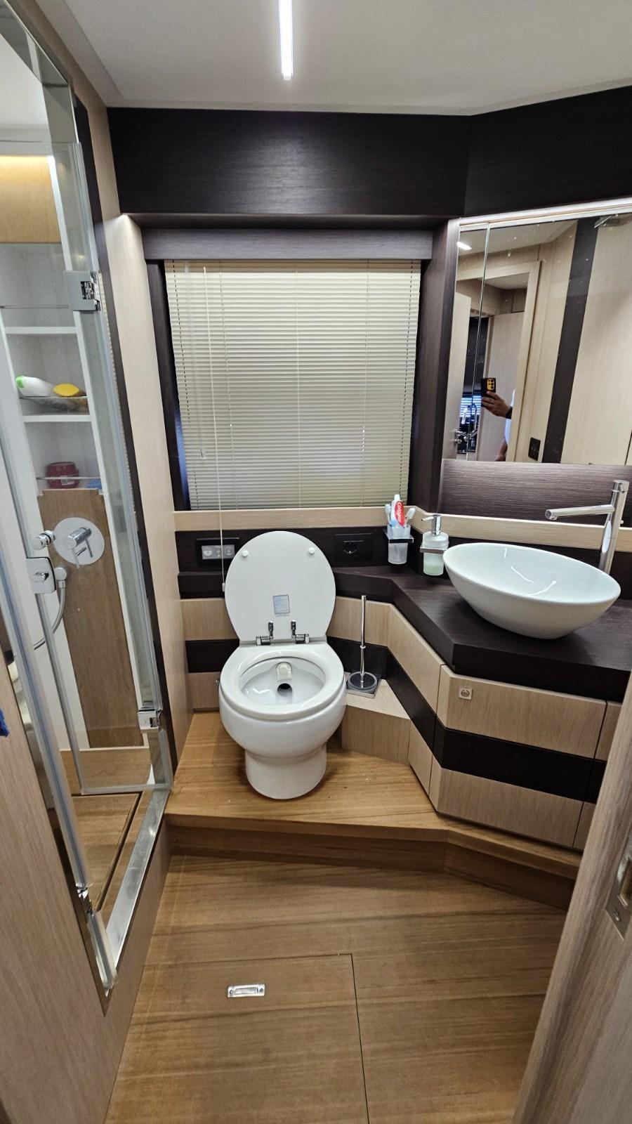 Master cabin with double bed and bathroom - guest cabin with two beds on the floor - guest cabin with two beds on the floor - guest bathroom.