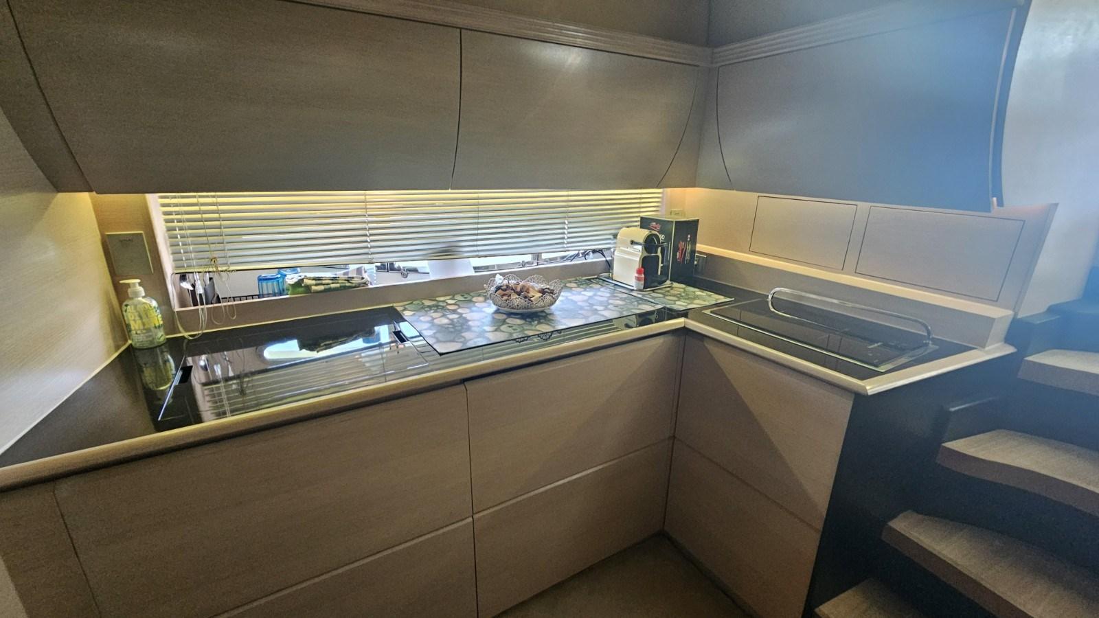 Kohler 8 kW generator set - Climma air conditioning - electric bow thruster - retractable electro-hydraulic gangway - electric hard-top awning - side windows wheelhouse with increased electric opening - wet bar in cockpit with sink, electric hob and double fridge - modified cockpit table (larger surface) - 2-burner electric hob - fridge - fridge/freezer - folding table in dinette - digital TV antenna - smart LCD TV - Sony dolby surround - tender with outboard - tender garage with electric winch - awning on bow sundeck - cockpit closing awnings.