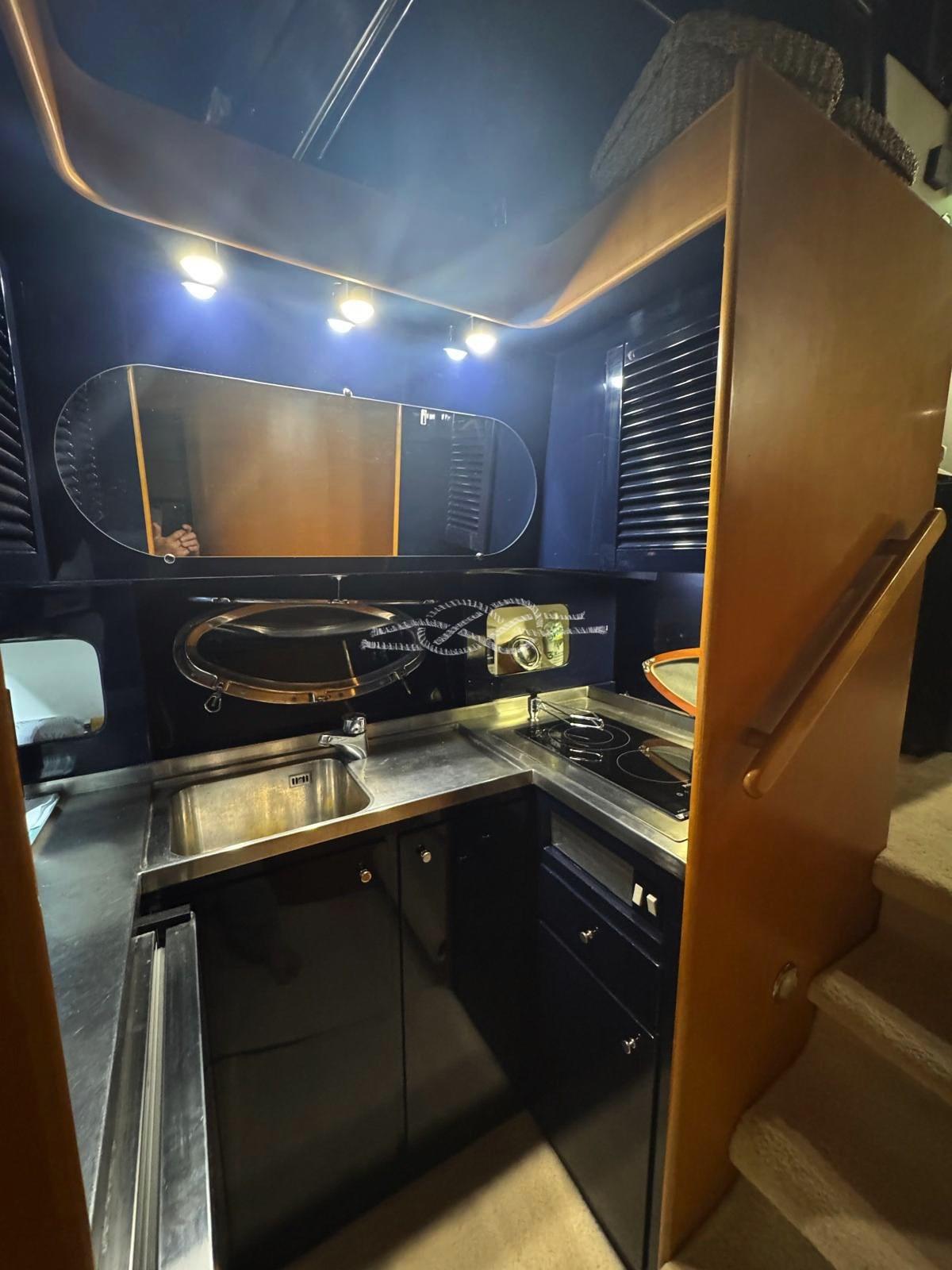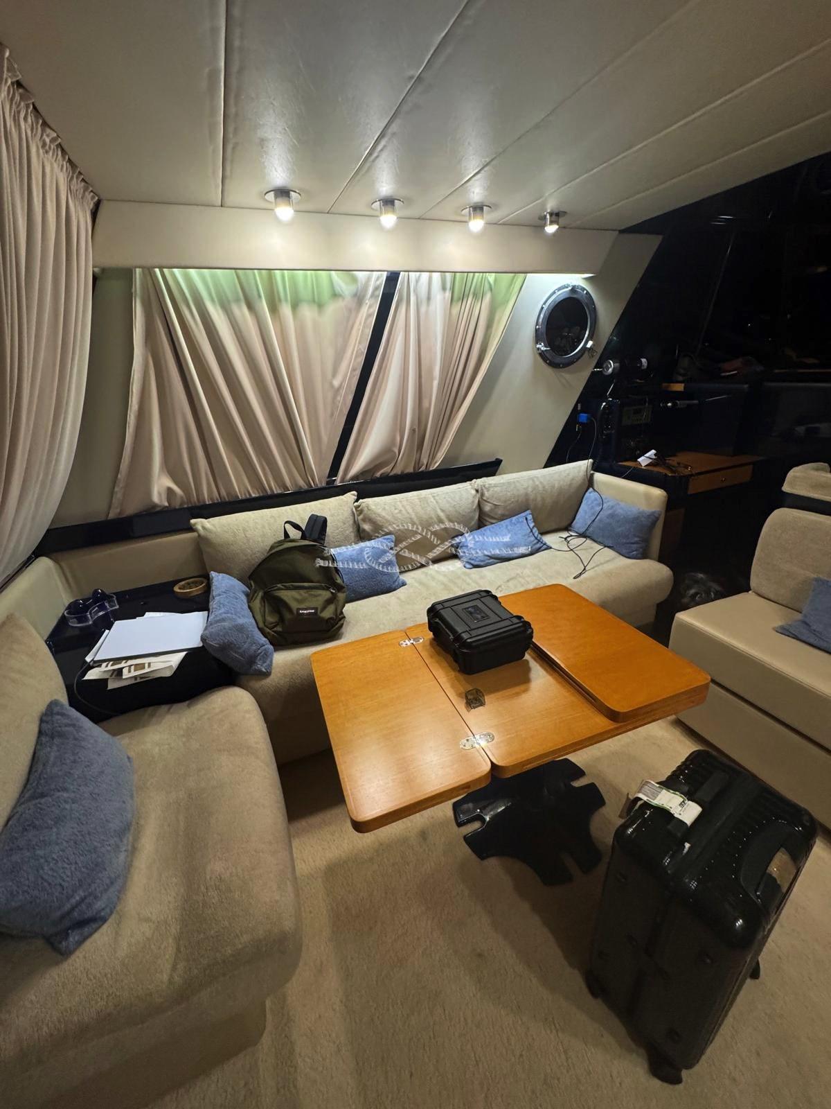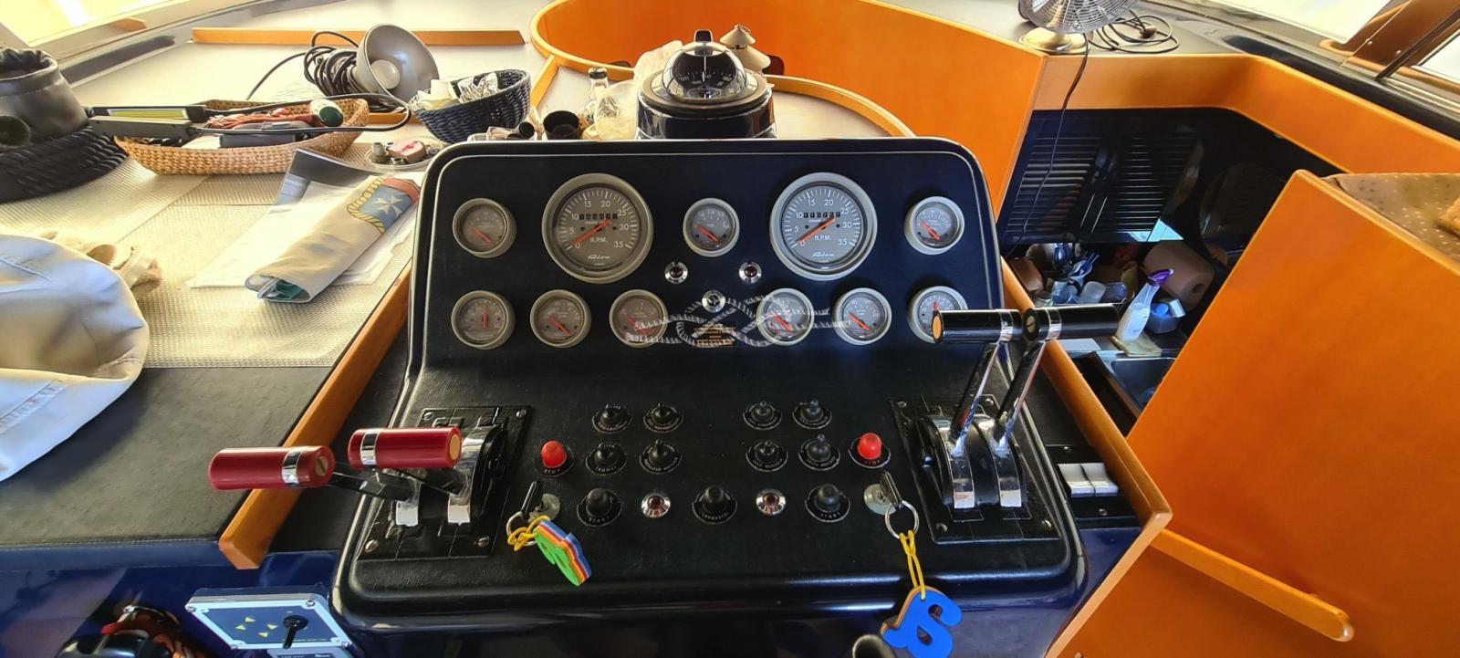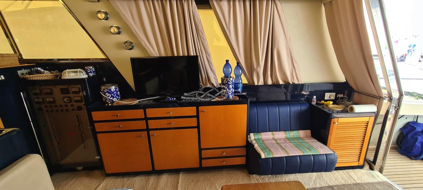 painting of the external green - replacement of all external and internal LED lights - new digital TV system with amplified antenna and two LCD TVs - installation of additional 220v sockets - renovation of the electrical system of the fly spotlight panel - renovation of the 12v fly system and 12v dinette sockets - replacement of dinette stereo - new macerator kit for the owner's bathroom and guest bathroom - new crew manual toilet - replacement of battery switch with new electronic battery switches - disconnection and verification of each battery (engines and services) - boiler replacement - new glass-ceramic plate - installation of battery switch for parallel generator set - replacement of neon lights with LED strips - installation of courtesy spotlights in the cockpit - installation of additional valves for bilge evacuation system (Lupe) - new electro-hydraulic gangway.