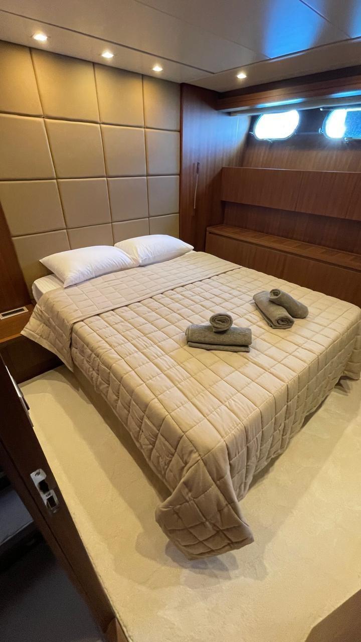 Master cabin with double bed, walk-in closet and bathroom - VIP cabin with double bed and bathroom - guest cabin with French bed and bathroom - guest cabin with two flat beds and bathroom.