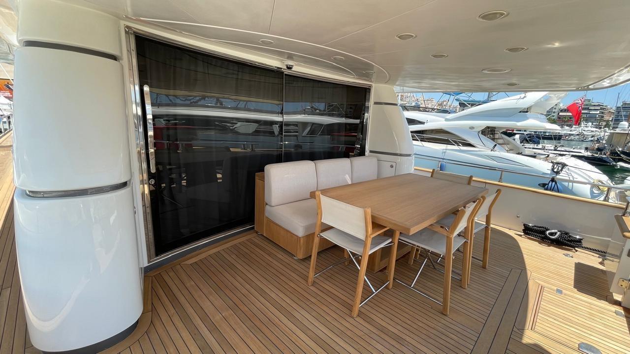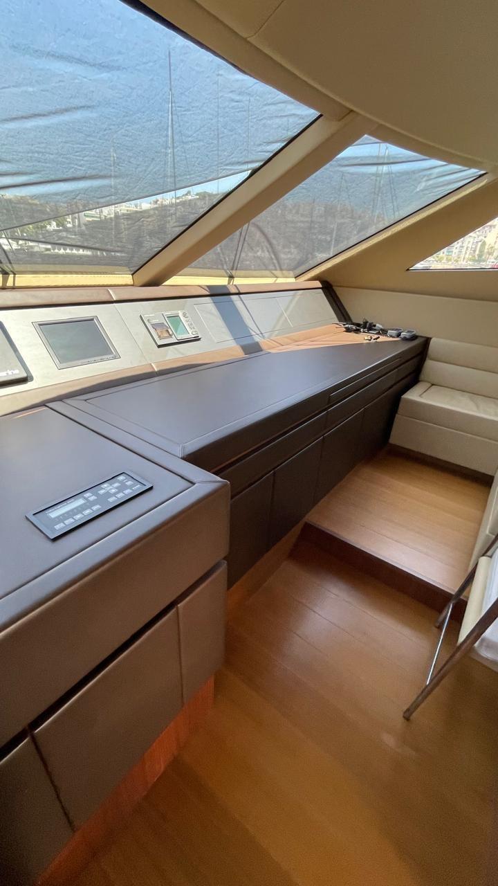 Engine Alarm, Bilge Alarm, Water pressure pump, Draining System, Teak Side Decks, Deck Shower, Twin Steering, Directional Spotlight, Hydraulic Flaps, Davits for tender on fly, Fire Extinguishing System, Flaps Indicators, Courtesy Lights, Underwater lights, Gangway, Platform, Teak deck, Entry door, Side door, Teak Cockpit, Shorepower connector, Water harbor connector system, Rollbar, Electric Windlass, swimming ladder, Saddles for tender, cockpit table, Tender, Horn, Stern Winches.