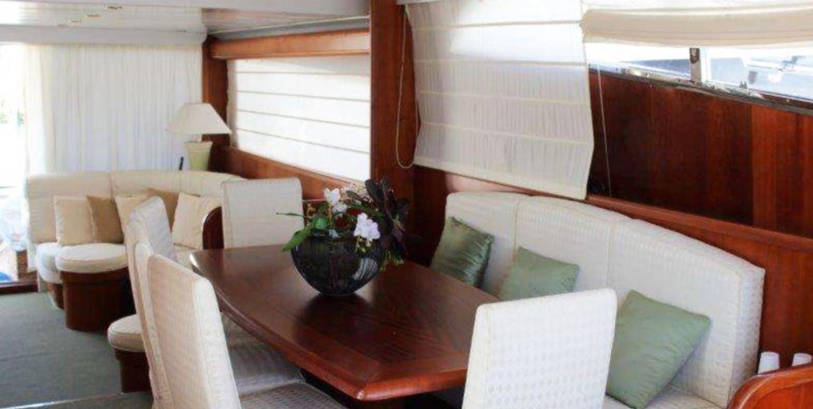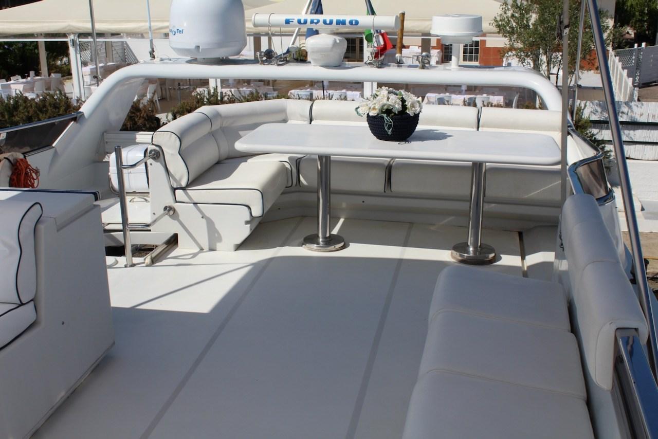 Engine Alarm, Water pressure pump, Teak Side Decks, Deck Shower, Hydraulic Flaps, Tender Crane, Fire Extinguishing System, Courtesy Lights, Gangway, Platform, Entry door, Side door, Teak Cockpit, Shorepower connector, Water harbor connector system, Electric Windlass, swimming ladder, Saddles for tender, cockpit table, Stern Winches.