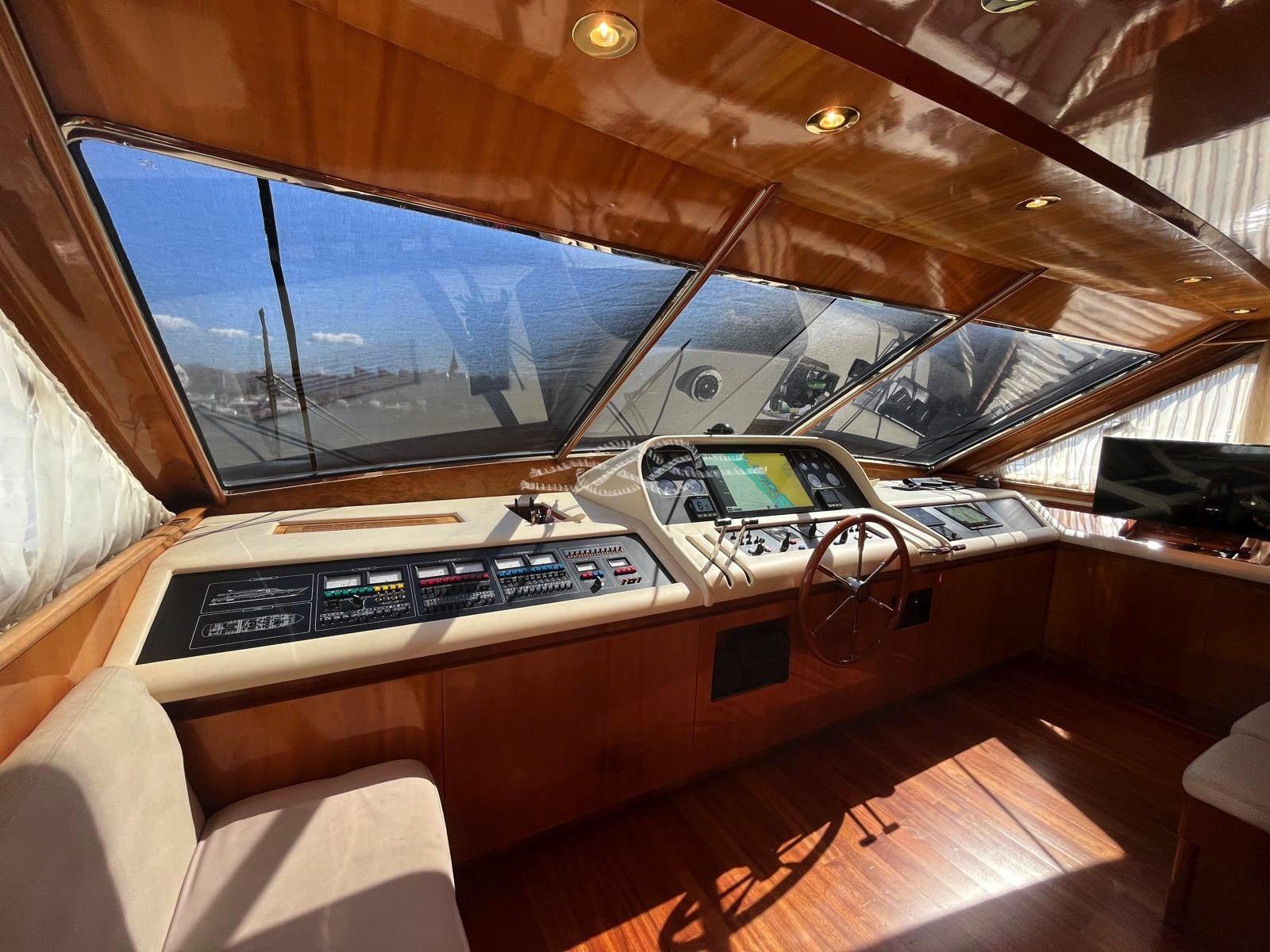 Engine Alarm, Bilge Alarm, Water pressure pump, 23 Batteries, Draining System, Teak Side Decks, Deck Shower, Twin Steering, Bow Thruster (idraulica), Hydraulic Flaps, Davits for tender on fly, Fire Extinguishing System, Flaps Indicators, Underwater lights, Gangway, Platform, Entry door, Side door, Teak Cockpit, Shorepower connector, Water harbor connector system, Rollbar, Electric Windlass, swimming ladder, Saddles for tender, cockpit table, Tender (con fuoribordo), Horn, Stern Winches.