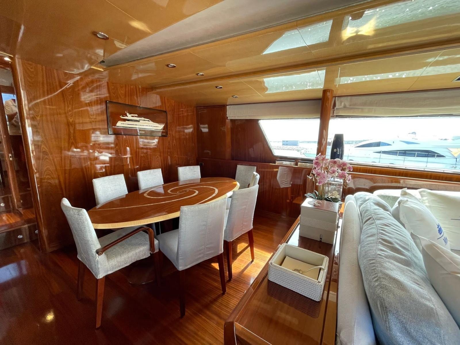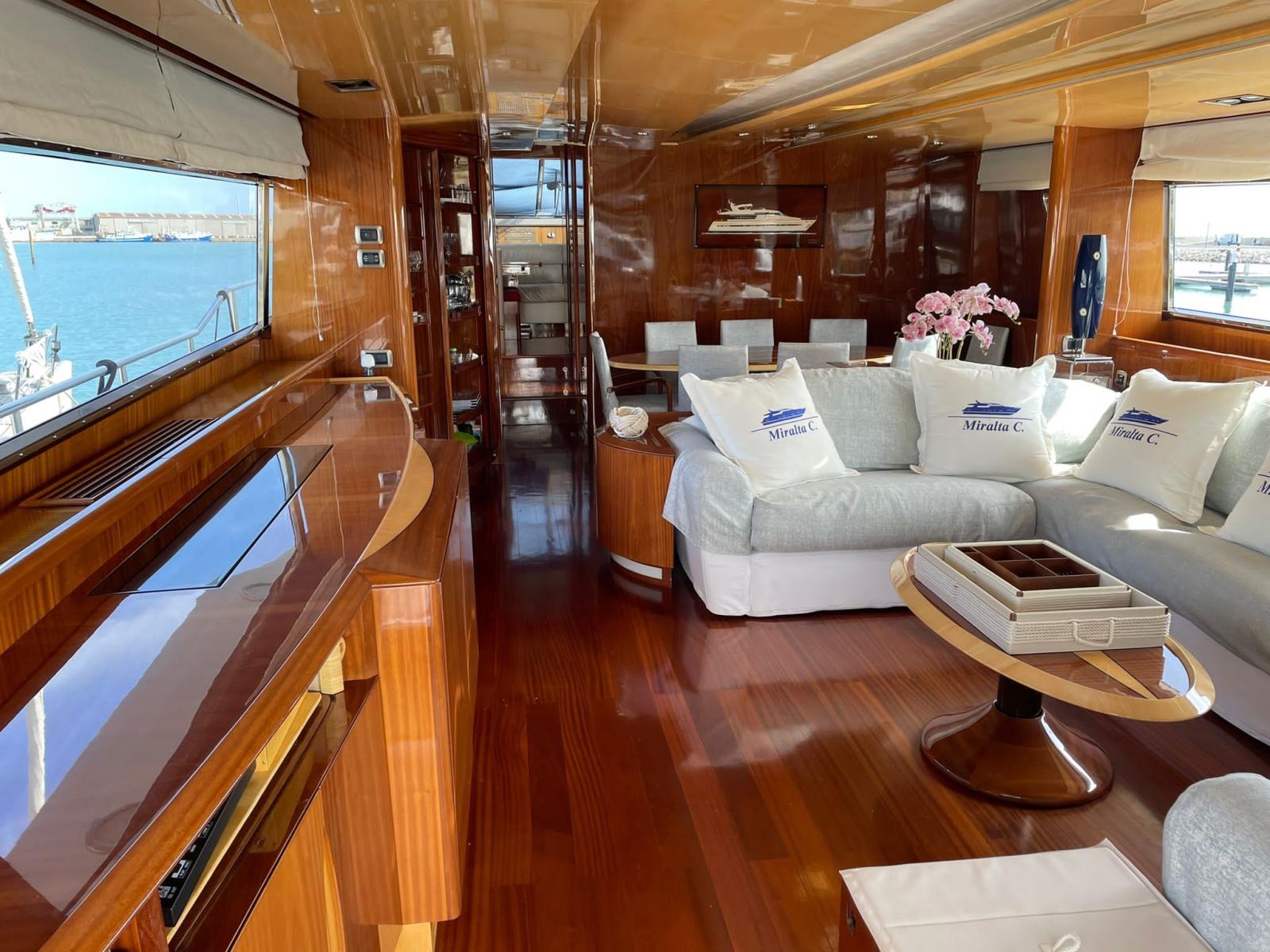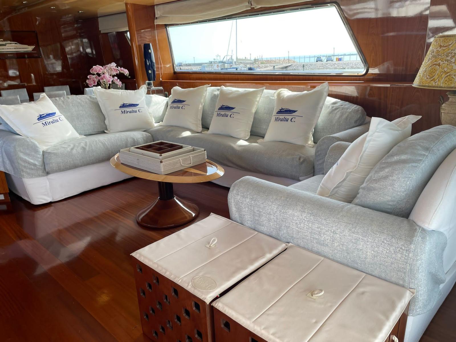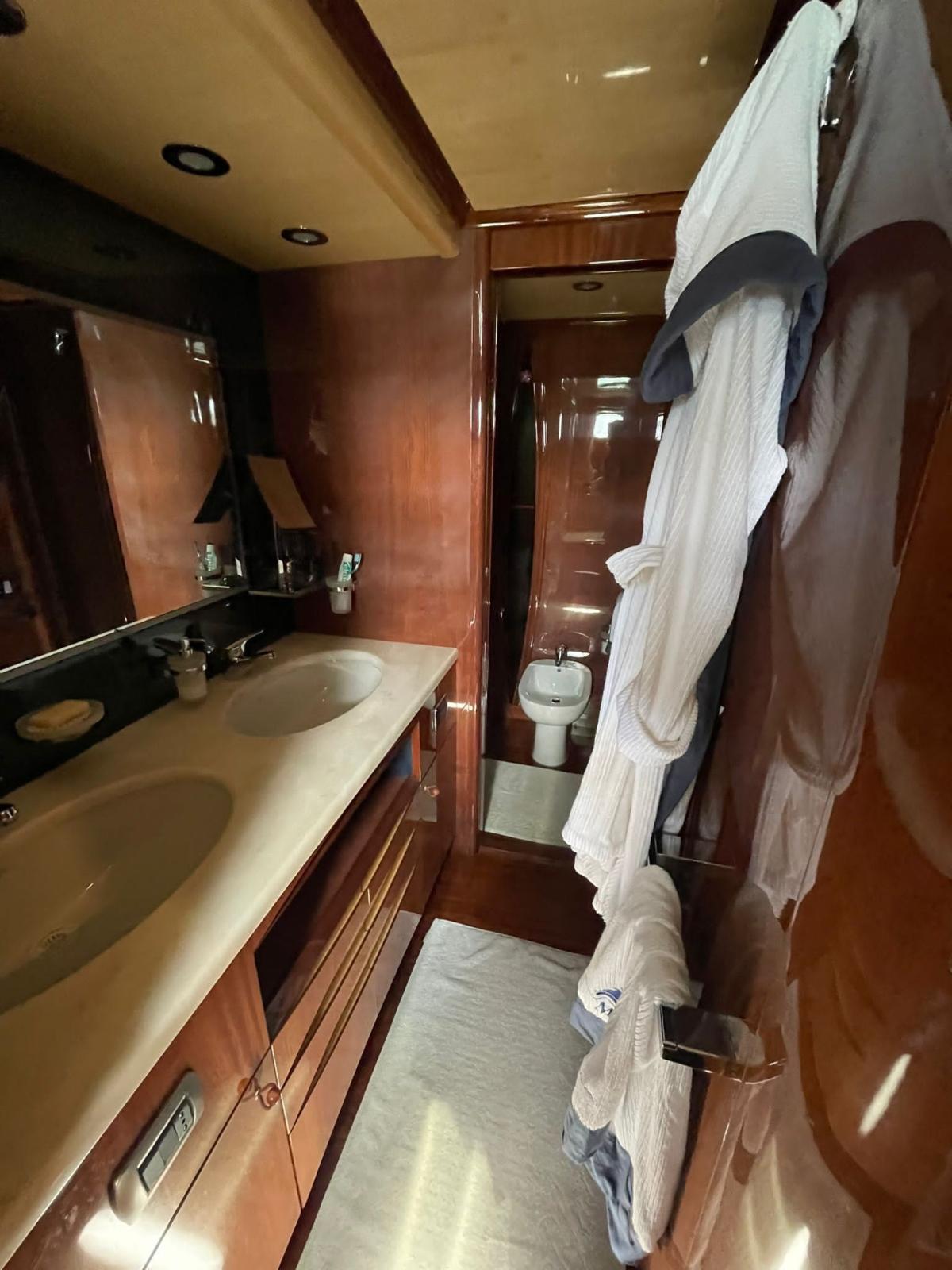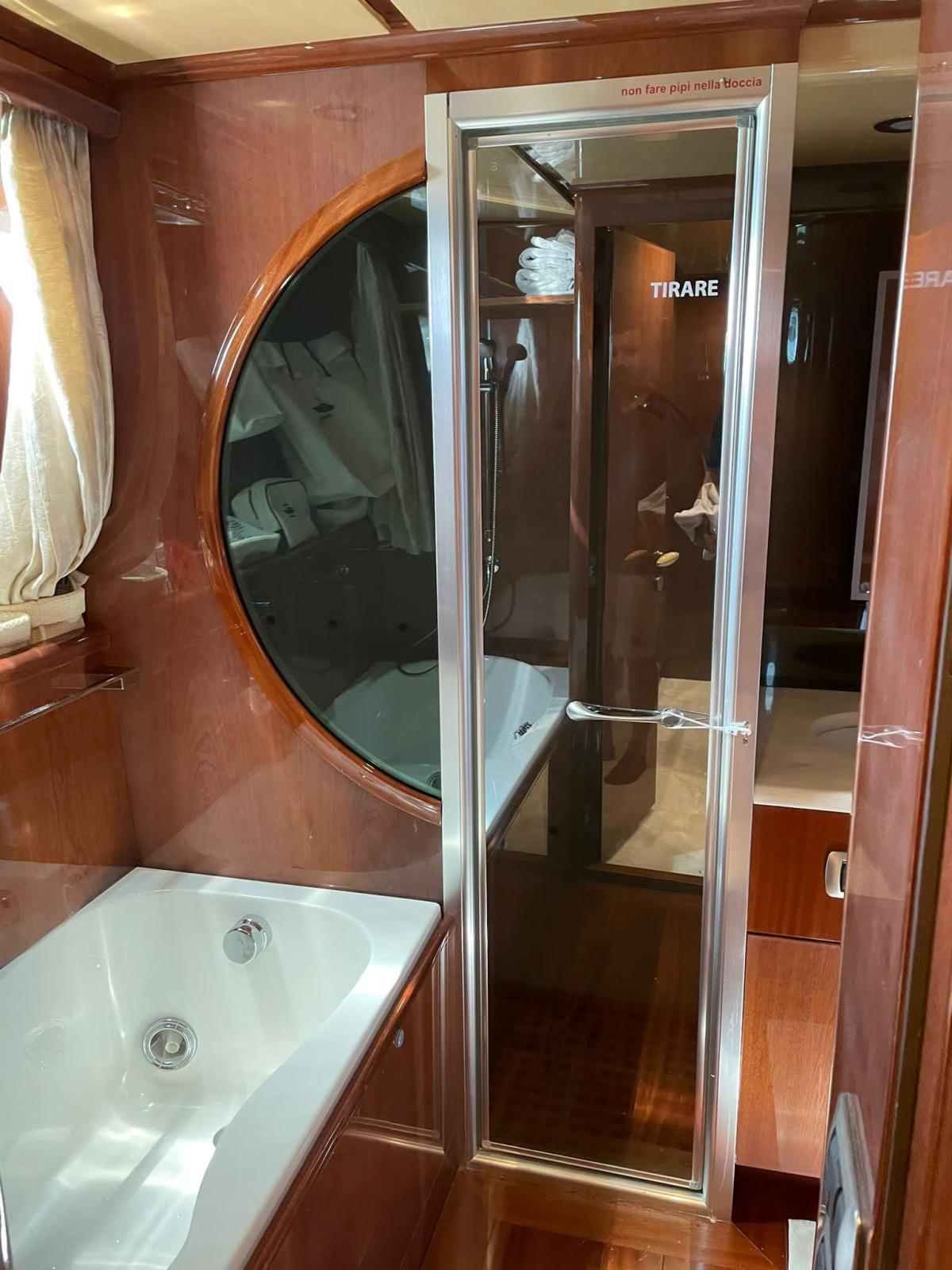 Works 2019/2020: access to the engine room from the stern - replacement of all toilets with modern Tecma - all LED lights - disassembly, verification, balancing of shaft lines (axles and stands) and propellers - replacement of the bushings of the trestles - cleaning of the heat exchangers of the main engines - overhaul of turbines - construction of two side doors to the cockpit for access on board when mooring on the side - replacement of all batteries (engines, services, generators) - replacement of all kitchen furniture and appliances - replacement of the two mooring anchors and related chains - construction of a fixed bimini top on the flying bridge helm station - replacement of all grey and black water tanks - renovation of crew accommodation - installation of a new Idromar watermaker - replacement of throttles with electronics - installation of stern thruster - new chargers and inverters - overhaul of all On-board pumps - Third control station at the stern plus fourth wireless station - Replacement of all seacocks and valves - Replacement of hydraulic seals Axles.