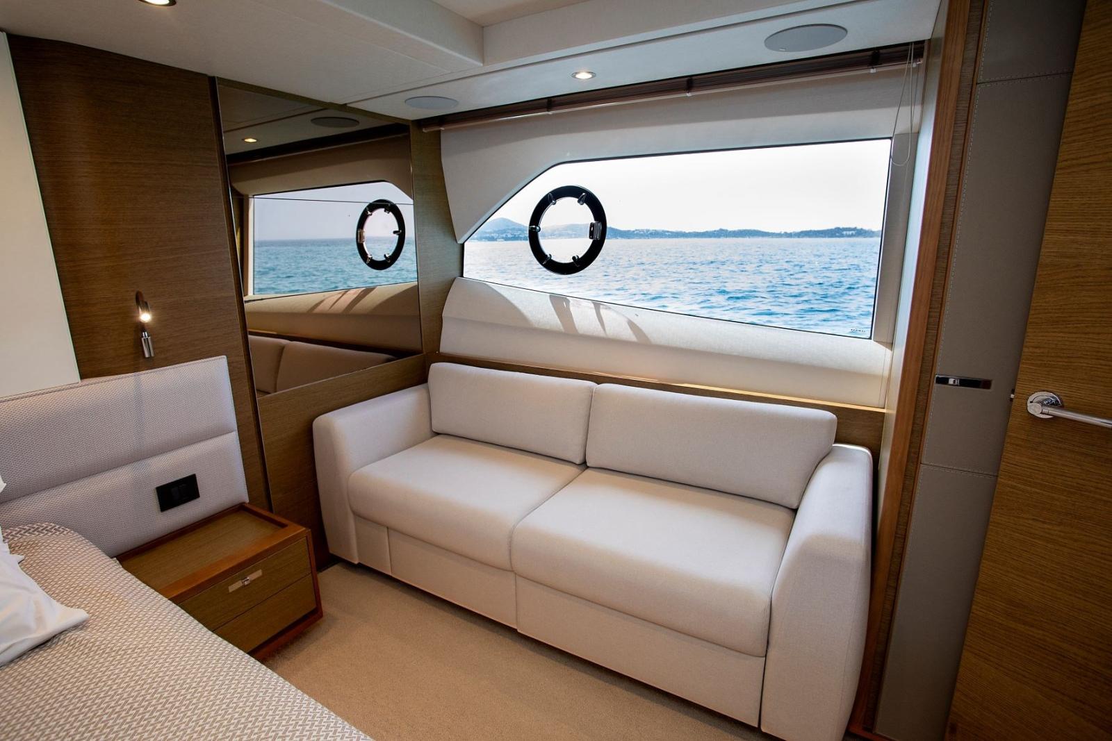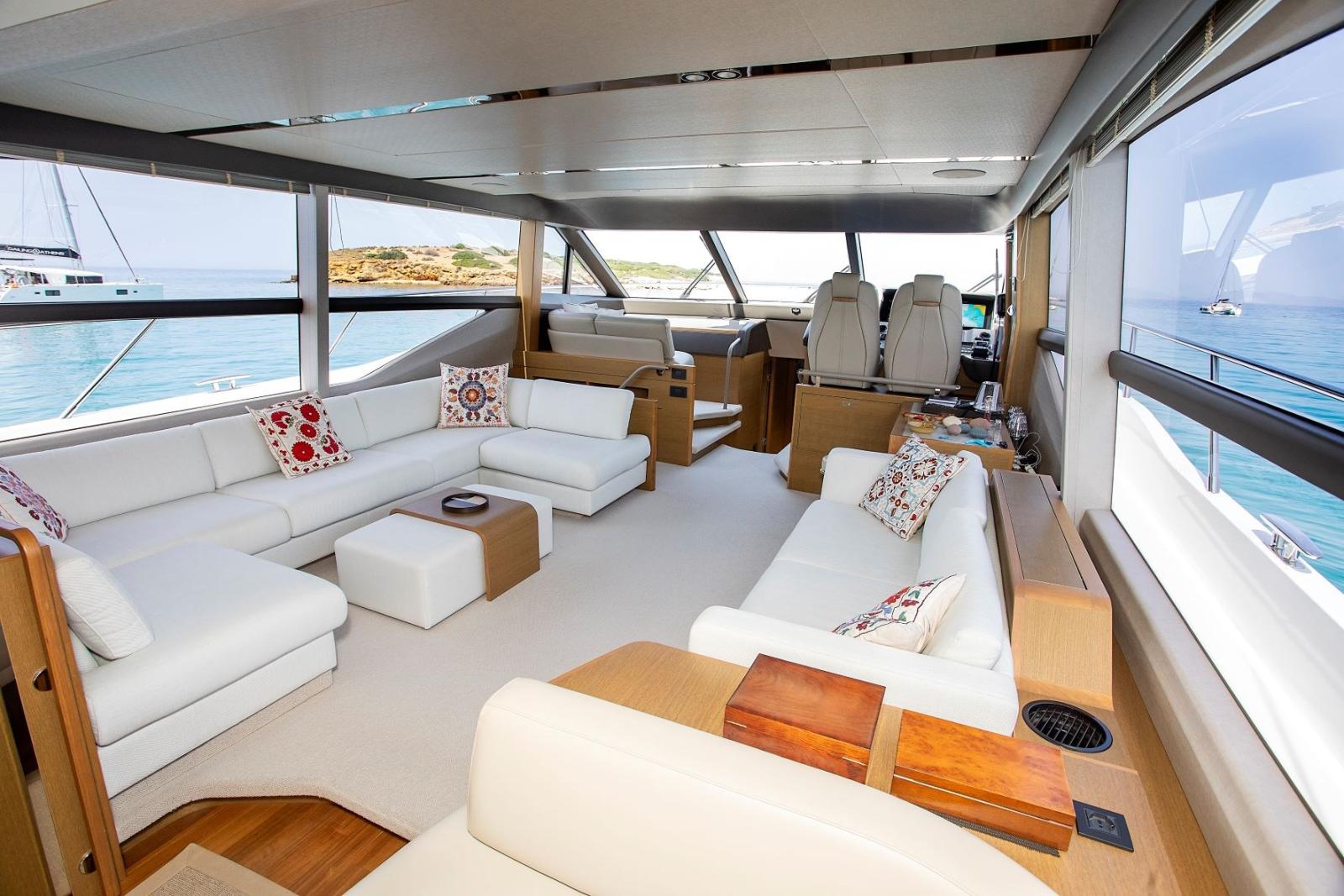 Fume/Gas Detector, Engine Alarm, Bilge Alarm, Water pressure pump, Deck Shower, Twin Steering, Hydraulic Flaps, Flaps Indicators, Courtesy Lights, Underwater lights, Gangway (Idraulica), Platform (Idraulica), Automatic Bilge Pump, Manual Bilge Pump, Entry door, Side door, Teak Cockpit, Shorepower connector, Water harbor connector system, Voltage Rectifier, Electric Windlass, swimming ladder, Stabilizers (Sleipner Fin stabilizerVF800), cockpit table, Stern Winches.
