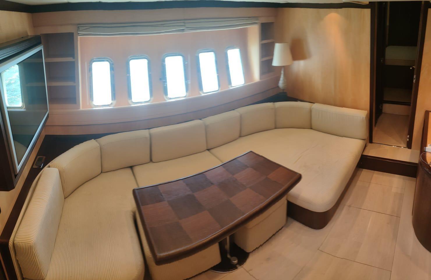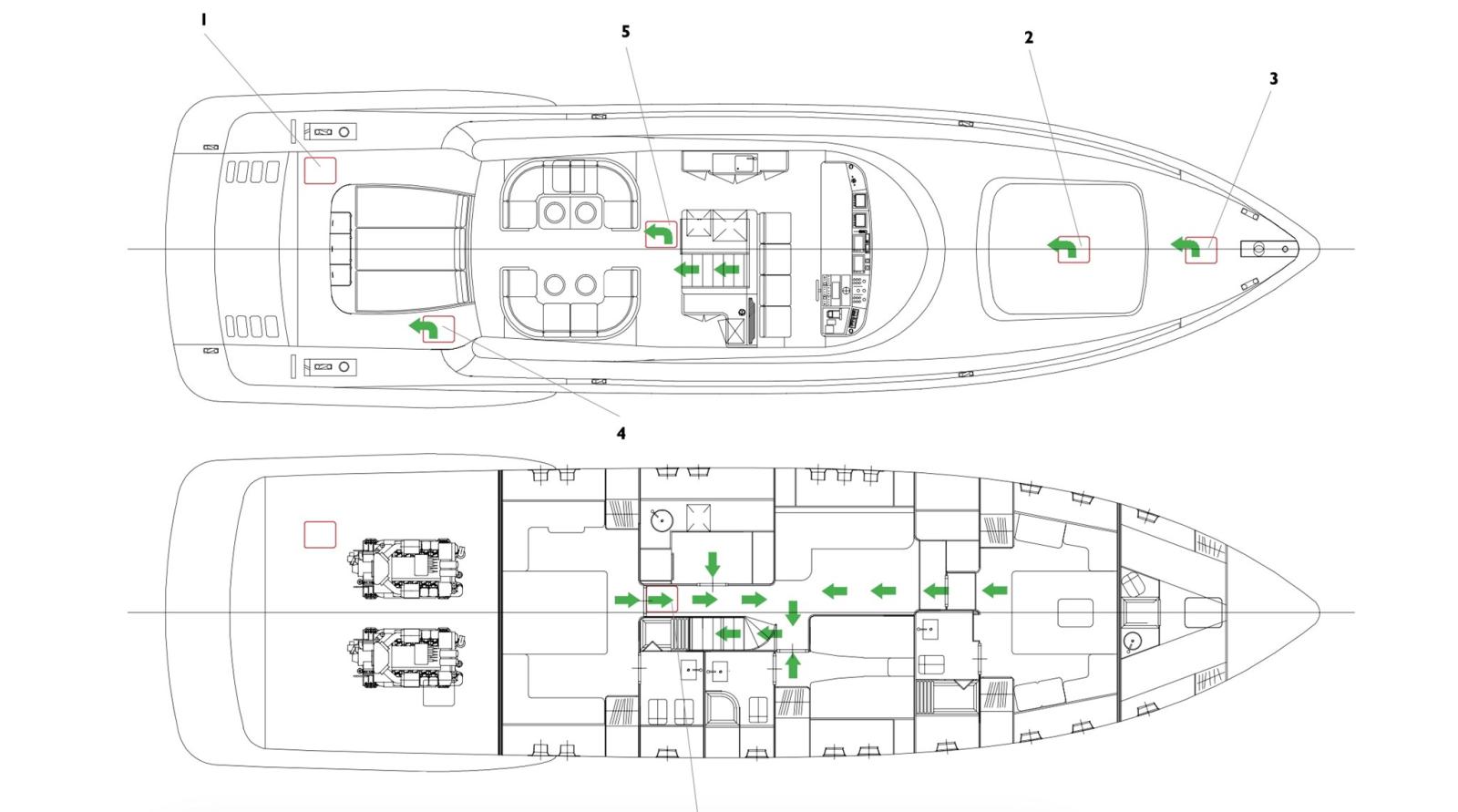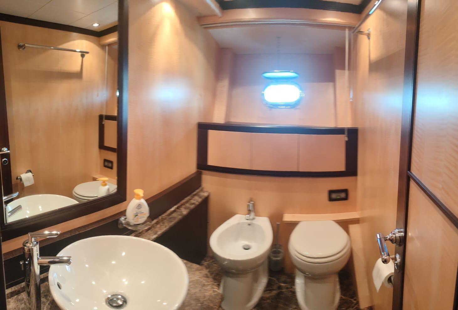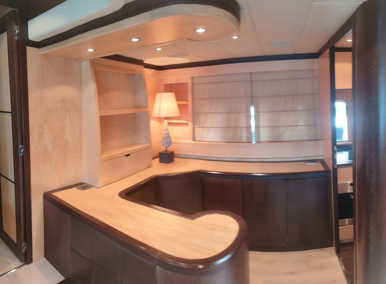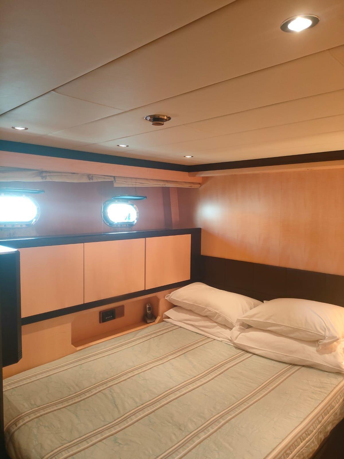 Fume/Gas Detector, Engine Alarm, Bilge Alarm, Alternator, Water pressure pump, Draining System, Teak Side Decks, Deck Shower, Directional Spotlight, Hydraulic Flaps, Tender Garage, Hard top, Fire Extinguishing System, Flaps Indicators, Anchor Chain Washdown, Washbasin in the cockpit, Courtesy Lights, Underwater lights, Gangway, Platform, Automatic Bilge Pump, Manual Bilge Pump, Teak deck, Teak Cockpit, Shorepower connector, Water harbor connector system, Voltage Rectifier, Electric Windlass, swimming ladder, Saddles for tender, cockpit table, Tender, Horn, Stern Winches.