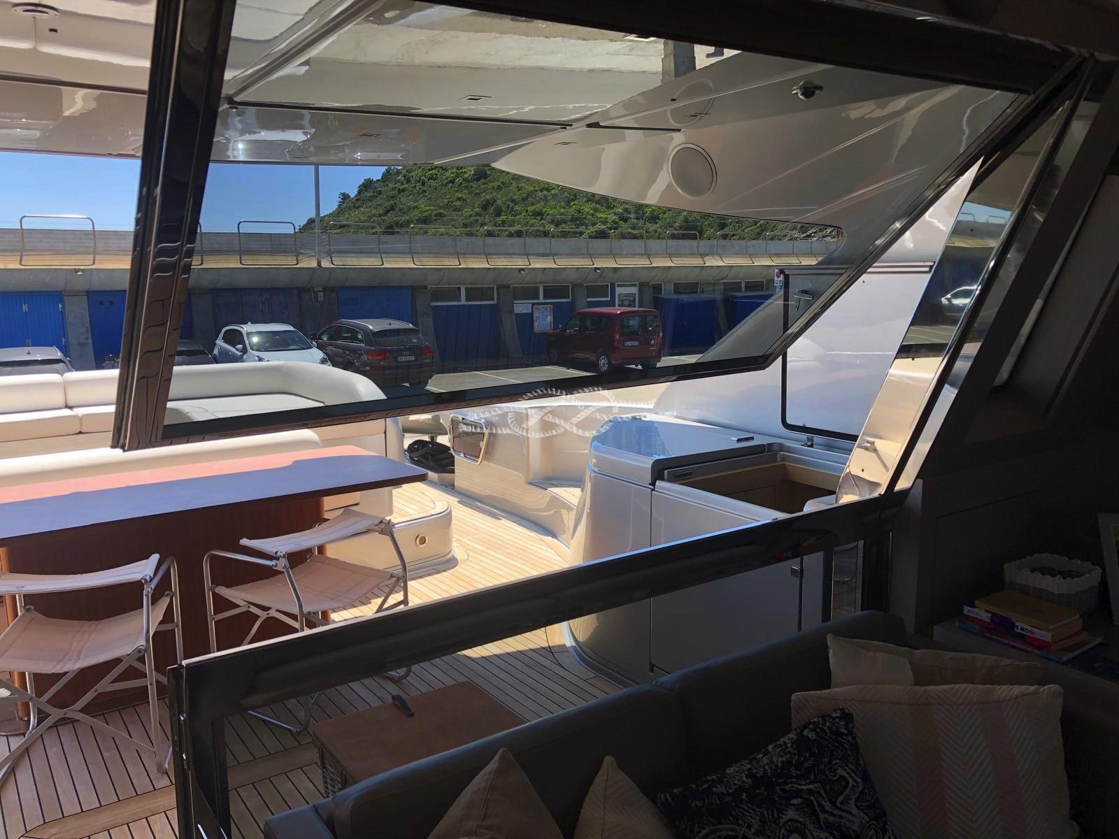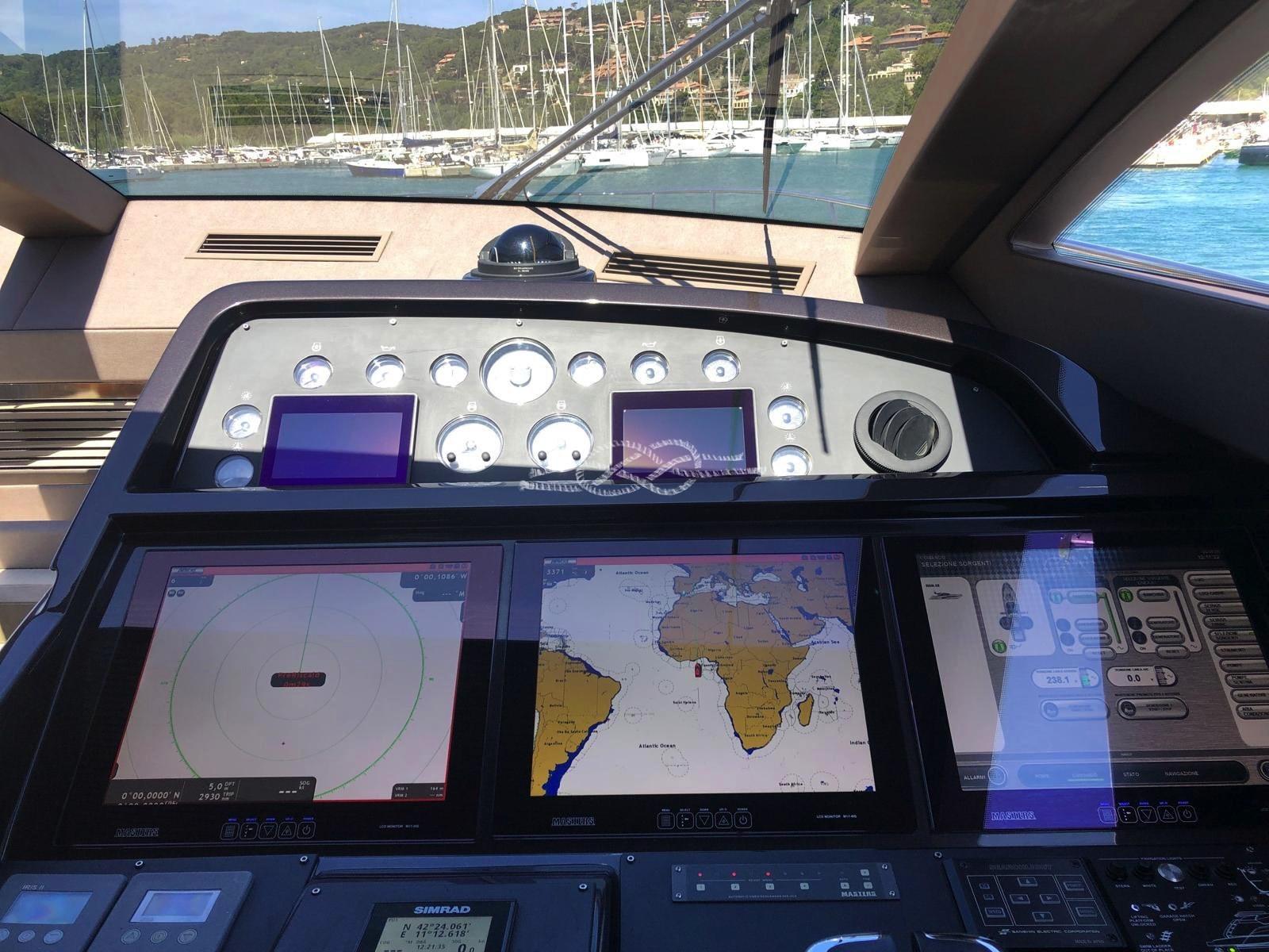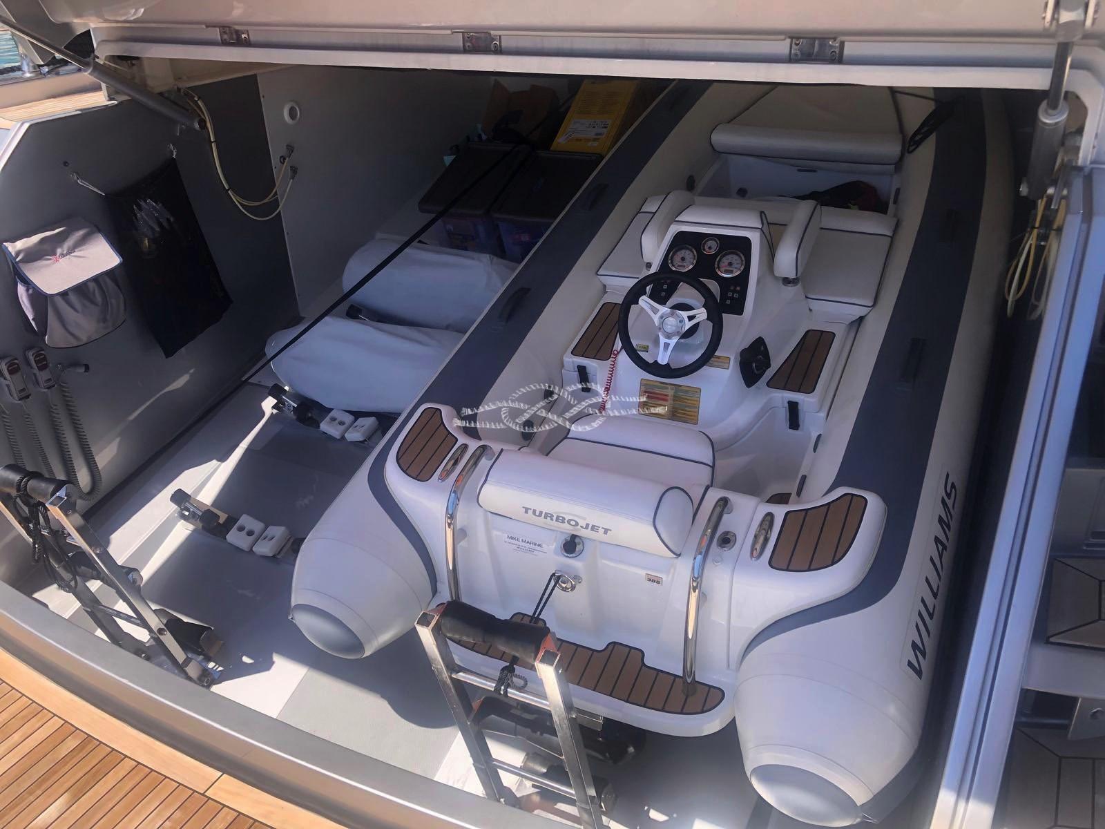 Two Seakeeper 9 stabilizers - ABTrac hydraulic bow and stern thrusters - retractable electro-hydraulic gangway - double anchor - tender lift stern platform - tender garage for tender and jet skis - Williams 385 jet tender - satellite TV antenna - LCD TV - stereo - air conditioning Condaria hot/cold - 2 x 28 kW Kohler generators - third control station at the stern - Miele 4-burner induction hob - Miele oven - fridge - freezer - Bosh dishwasher - ice maker - fridge outdoor - wet bar in the cockpit with sink and grill - washing machine dryer - Idromar watermaker.