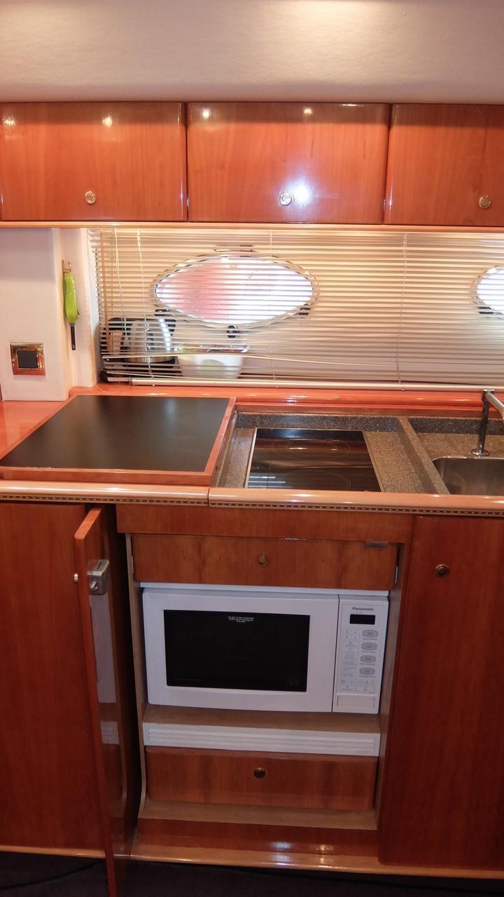 Electric bow thruster - hot/cold air conditioning - Onan 12 kW generator set - tender garage - Williams 280 waterjet tender - double bathing ladder - Opacmare electro-hydraulic gangway - underwater lights - microwave - 2-burner electric hob - fridge/freezer - cockpit bar cabinet with sink, grill and fridge - TV antenna - LCD TV - oversized stern bridge as V55.