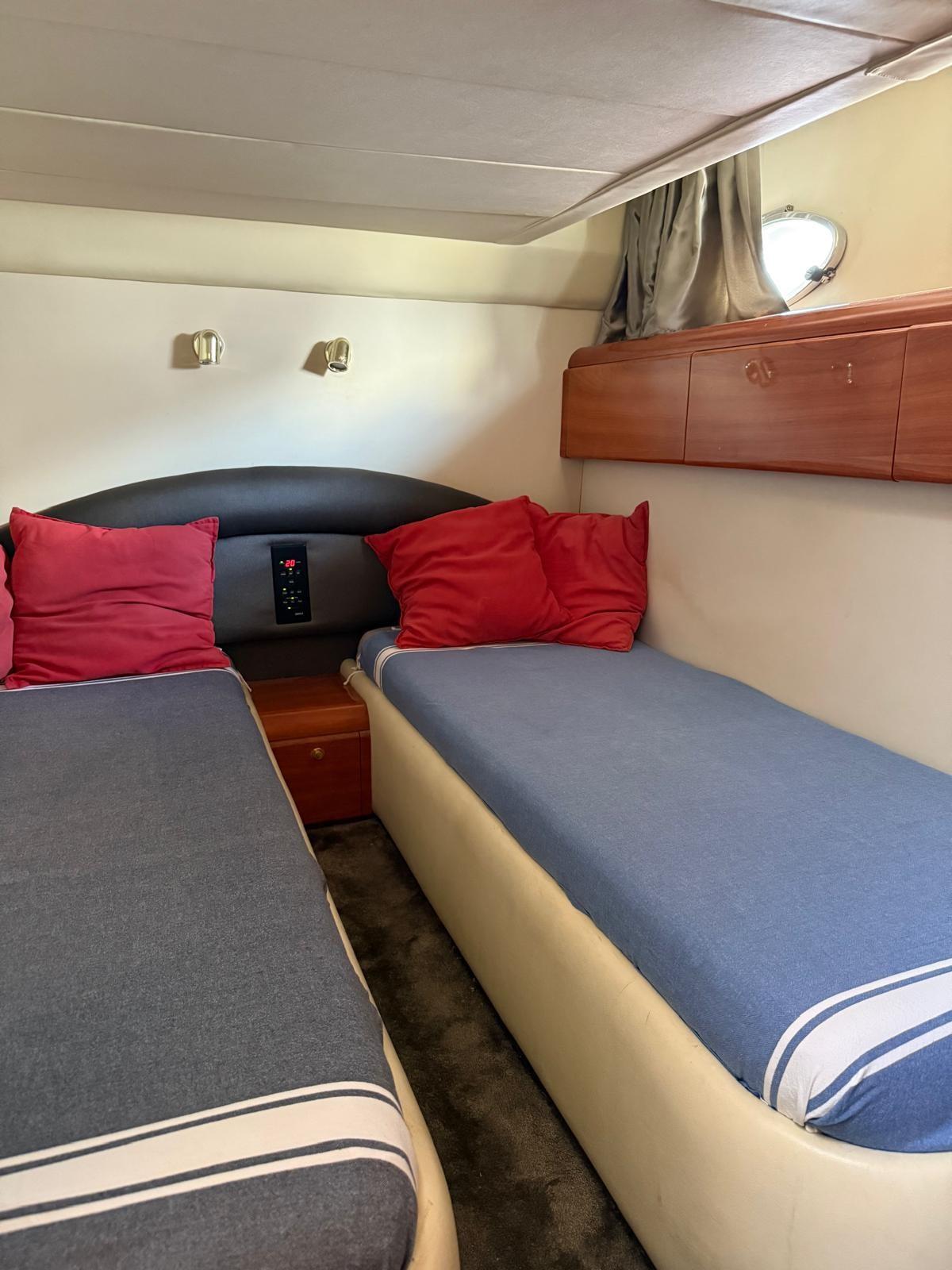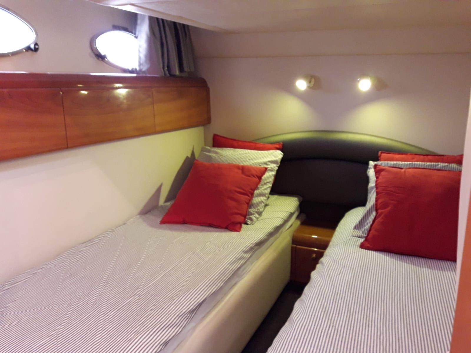 Master cabin with double bed and bathroom - guest cabin with two flat beds (convertible to double) - guest cabin with two flat beds (convertible to double) - guest bathroom.