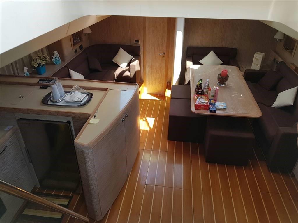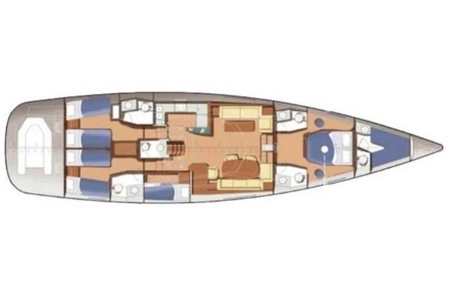 Large cockpit with table - dinette with sofas, table and galley - table and chart station - version with master cabin with double bed and bathroom in the bow - guest cabin with two flat beds and bathroom - guest cabin with two flat beds in the middle of the boat both towards the stern - guest cabin with two overlapping beds - guest bathroom shared between cabin with overlapping beds and cabin with flat beds.