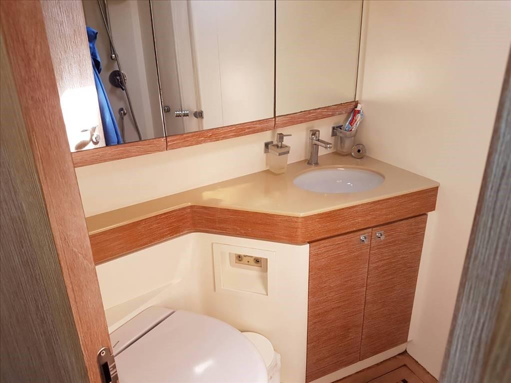 dismantling and reassembly of all deckhouse windows and deck hatches - painting of the deckhouse - new upholstery of the saloon and owner's cabin - renovation of the cockpit folding table - replacement of trestle bushings - installation of new PSS axle seals - replacement of all sea intakes, including engines - replacement of Harken electric winch motors - installation of telephone SAT antenna - replacement of all service batteries and engines with AGM batteries.