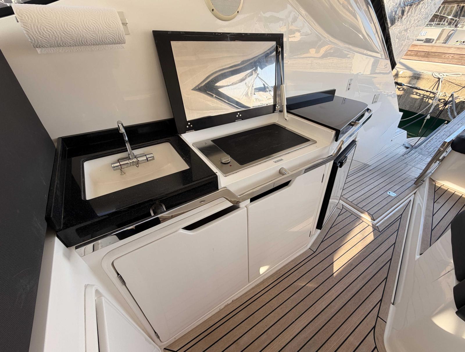The cockpit provides a welcoming and social space, centered around a fully equipped wetbar (grill, sink, refrigerator), along with generous lounging areas, ideal for enjoying time at sea.