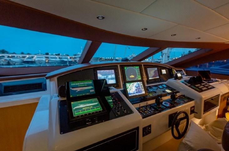 Compass (magnetica), Electronic engine control (MTU), On-Board Computer, Chain counter, Display (elettronici del motore MTU), Depth Sounder (Raymarine), Fax (HP 5522), GPS (Furuno), Joystick (sul sedile sportivo della timoneria), Consumption monitor, Autopilot (Simrad AP70), Plotter with GPS antenna (Garmin + Timezero GPS con navigazione 3D), Control panel, Radar (Furuno), VHF Radio (Furuno), GSM Phone (Iridium).