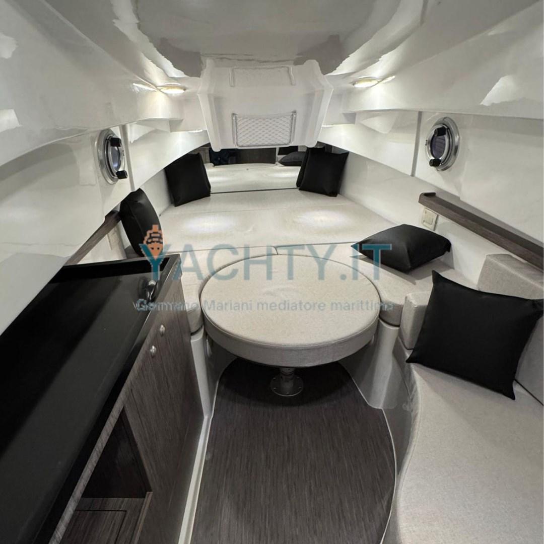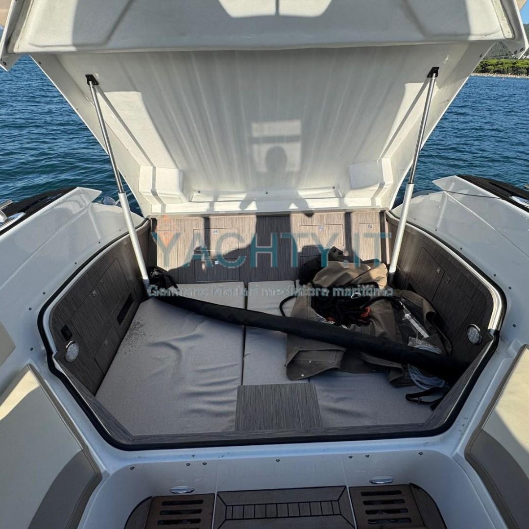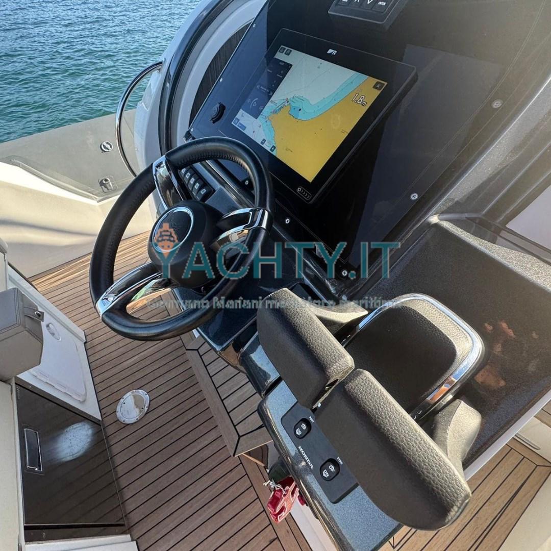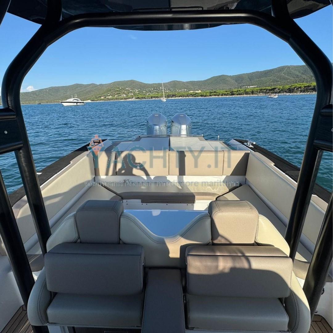 The set-up enhances the experience on board with T-Top equipped with panoramic glass, electric power steering and electronic throttles, while the teak in the cockpit contributes to creating an elegant and welcoming environment. The presence of the additional cabin in the aft hatch further expands livability, making the boat ideal even for weekends and extended stays.
