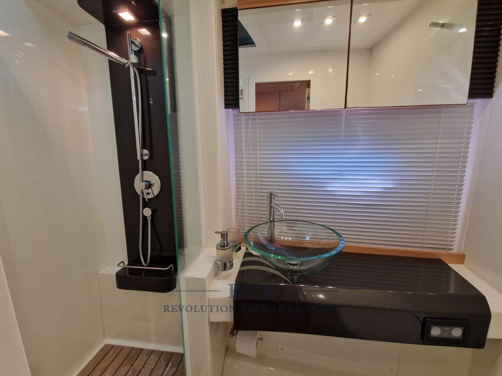 Engine Alarm, Water pressure pump, Special Colour (BLUE NAVY), Deck Shower, Directional Spotlight, 2 Hydraulic Flaps, Hard top, Fire Extinguishing System, Washbasin in the cockpit, Courtesy Lights, Gangway (IDRAULICA A SCOMPARSA), Platform (TENDERLIFT), Automatic Bilge Pump, Entry door, Teak Cockpit, Shorepower connector, Electric Windlass, swimming ladder, cockpit table.