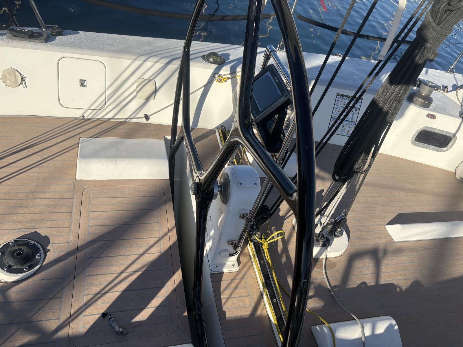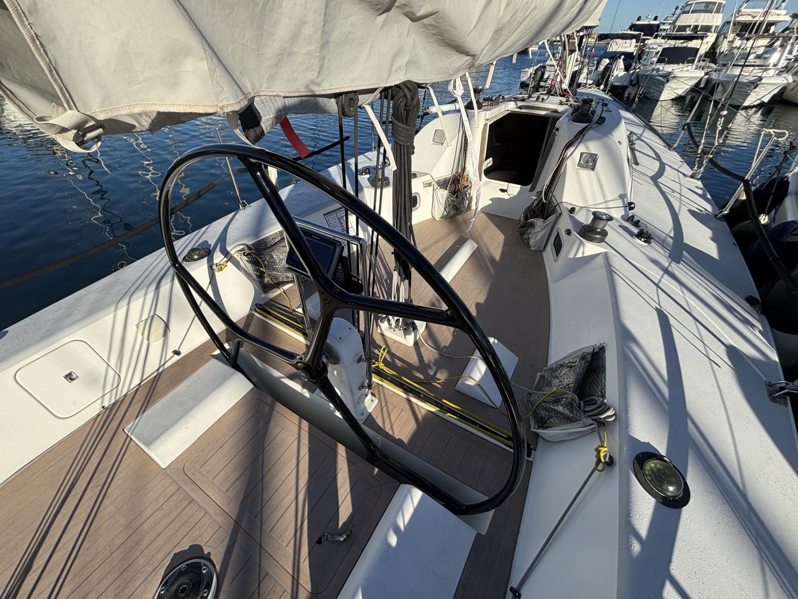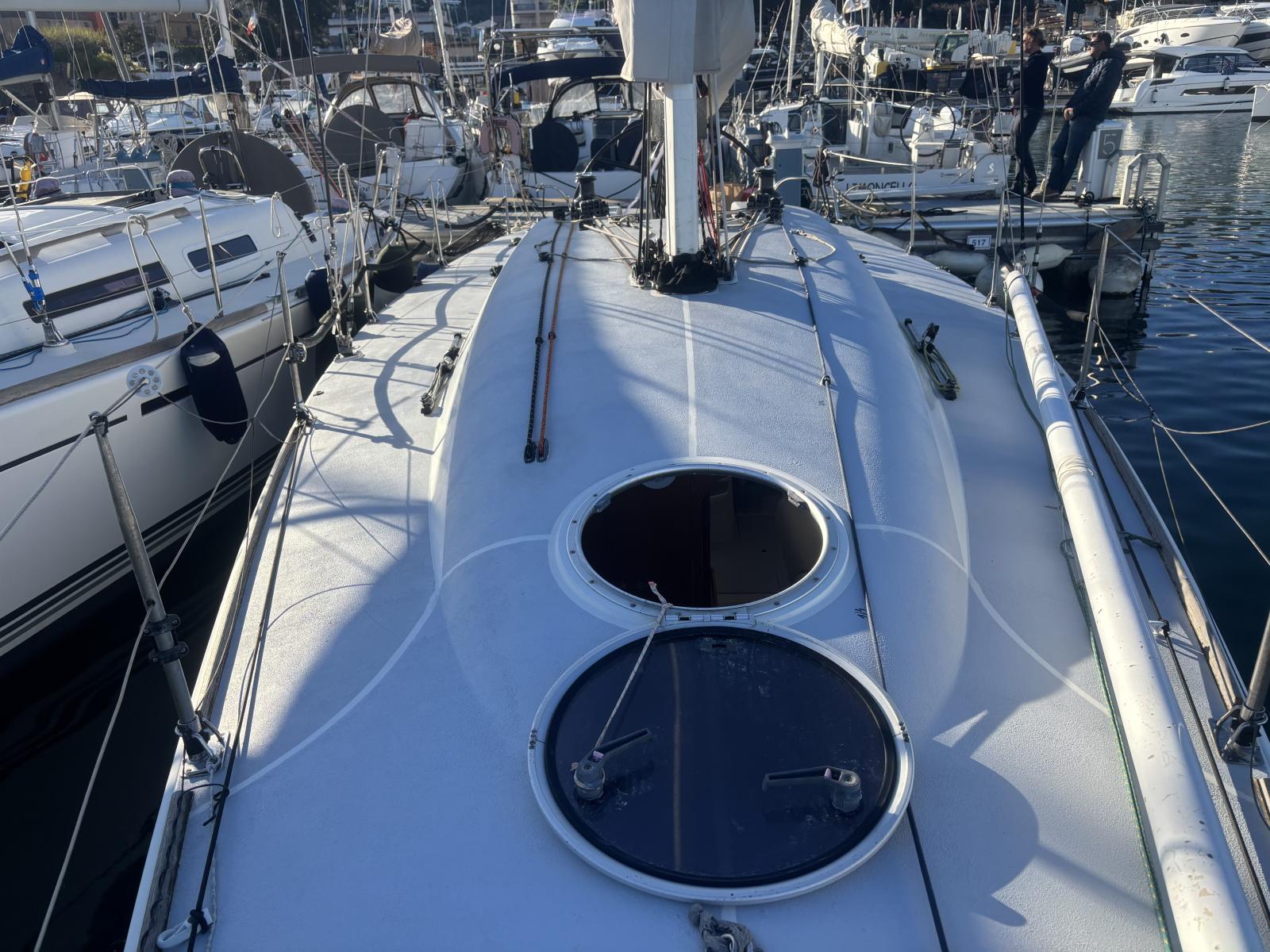 Complete deck equipment including electric windlass with removable bow roller, removable swim ladder, 4 Harken winches, carbon steering wheel, retractable carbon bowsprit, carbon spinnaker pole and recent Dyneema running rigging. Fully optimized for racing performance.