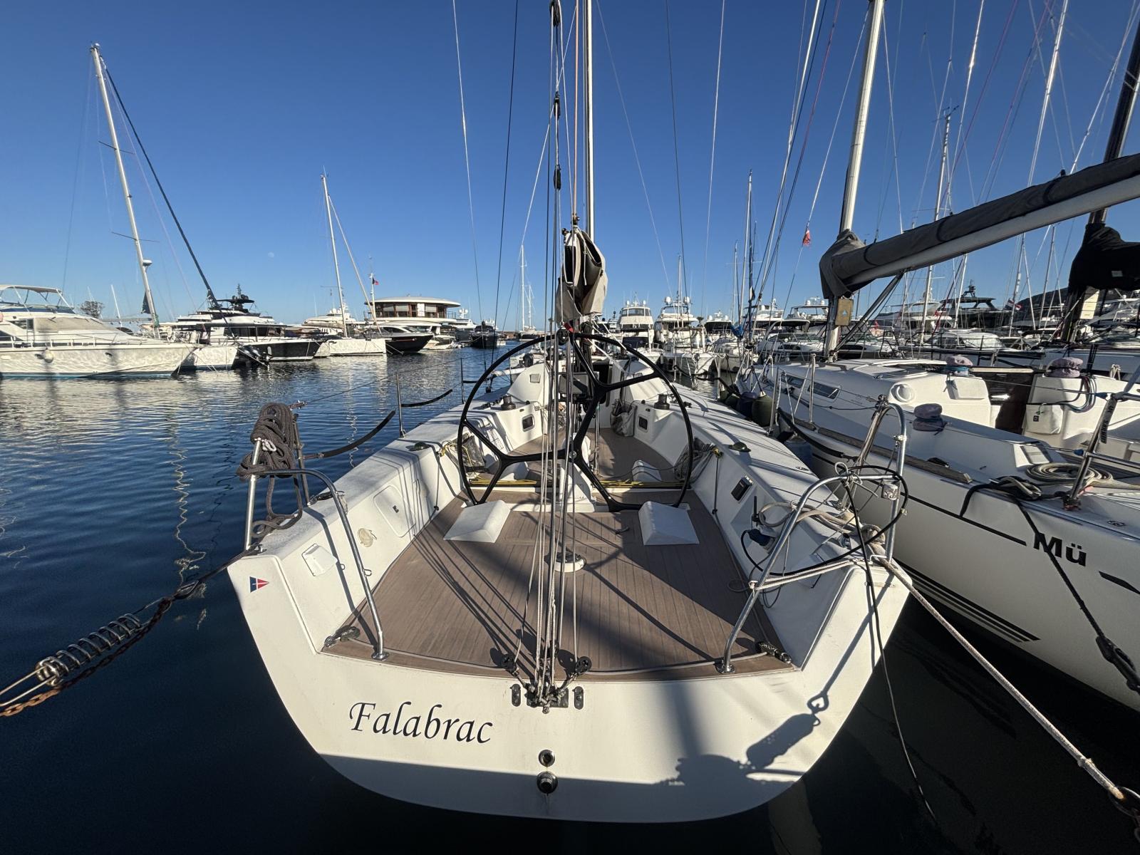 36 OD sailing yacht from 2003 optimized for racing and fast cruising, featuring Pauger carbon mast and boom, recent Dyneema rigging and full deck equipment including Harken winches, carbon bowsprit and spinnaker pole.