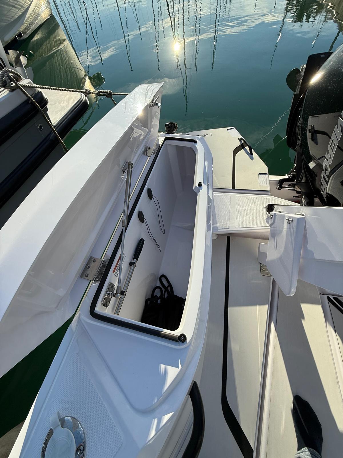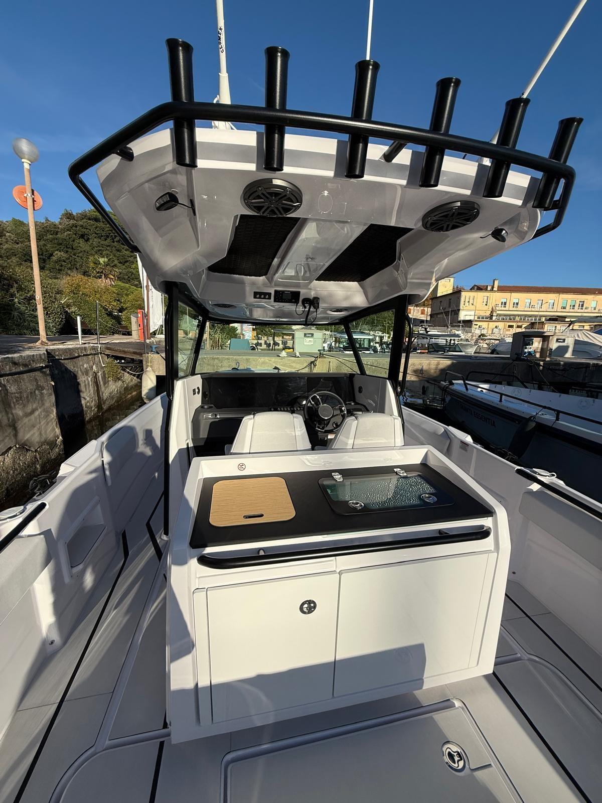 Pair of black Mercury 200 hp engines, COMPLETE FISHING OPTIONS, 2 Live Tanks, fish tank with macerator, fishing module rod holder with bait drawer, work lights, folding bench at the stern, JL Audio premium audio, Simrad electronics: NSX 12 inches, high-wide chirp thru-hull transducer, Vhf.