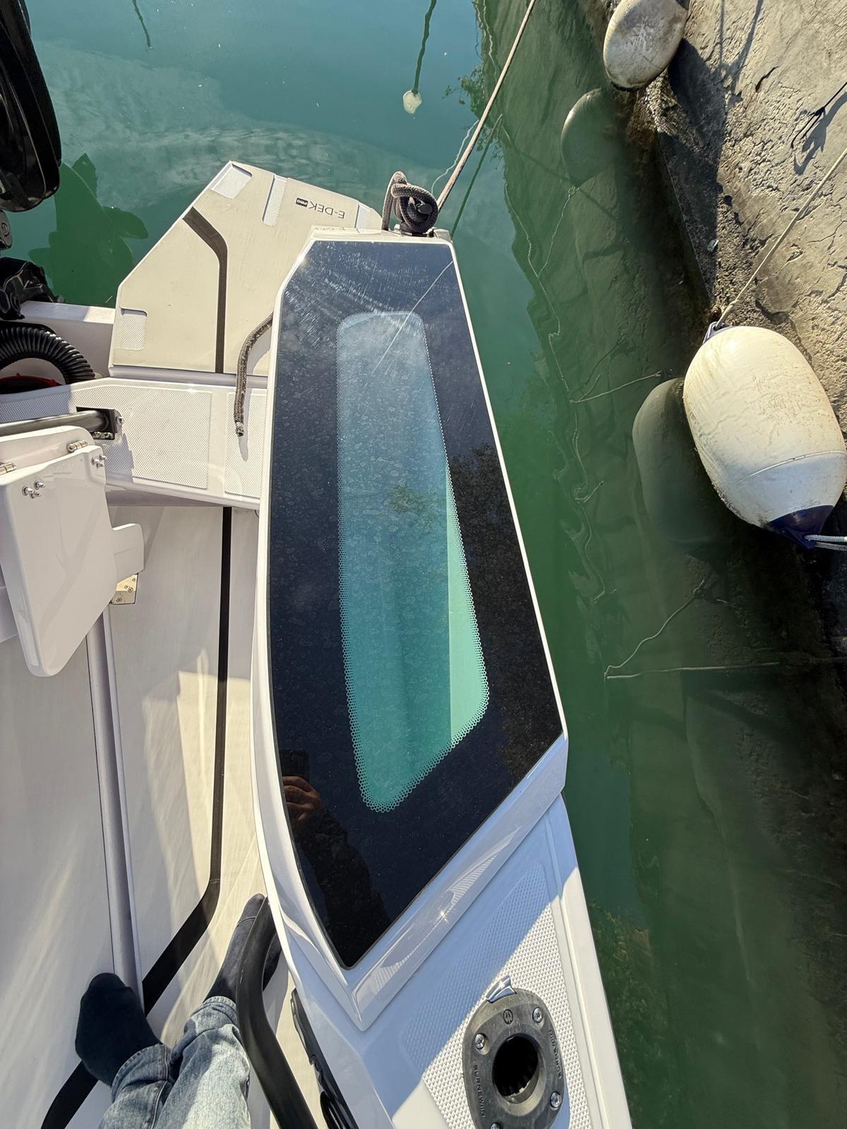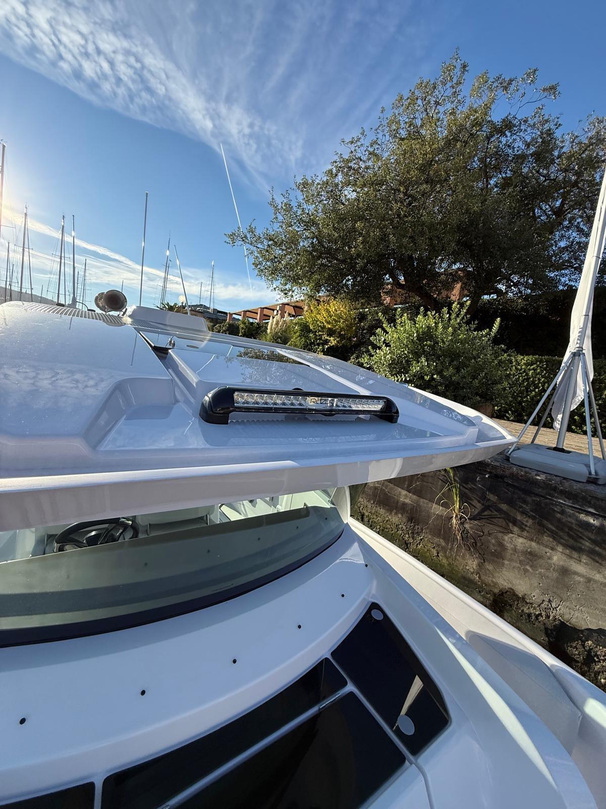 Engine Alarm, Bilge Alarm, Alternator, Water pressure pump, Auto-Trim, Shore power cable, Deck Shower, Headlights fixed on the stem, Electric Flaps, Hard top, Washbasin in the cockpit, Courtesy Lights, Underwater lights, Automatic Bilge Pump, Manual Bilge Pump, Deck Wash Pump, Shorepower connector, Water harbor connector system, swimming ladder, Horn.