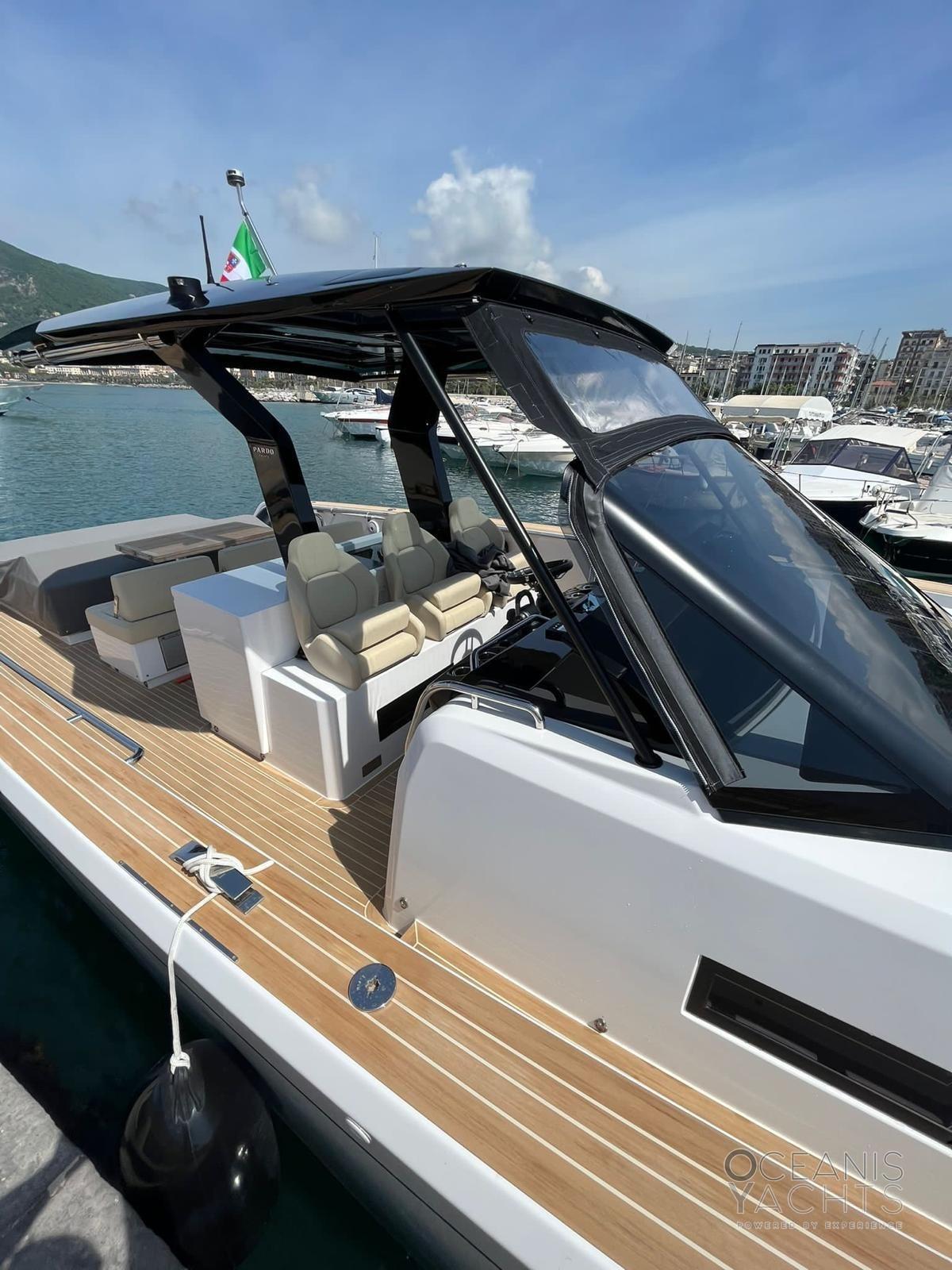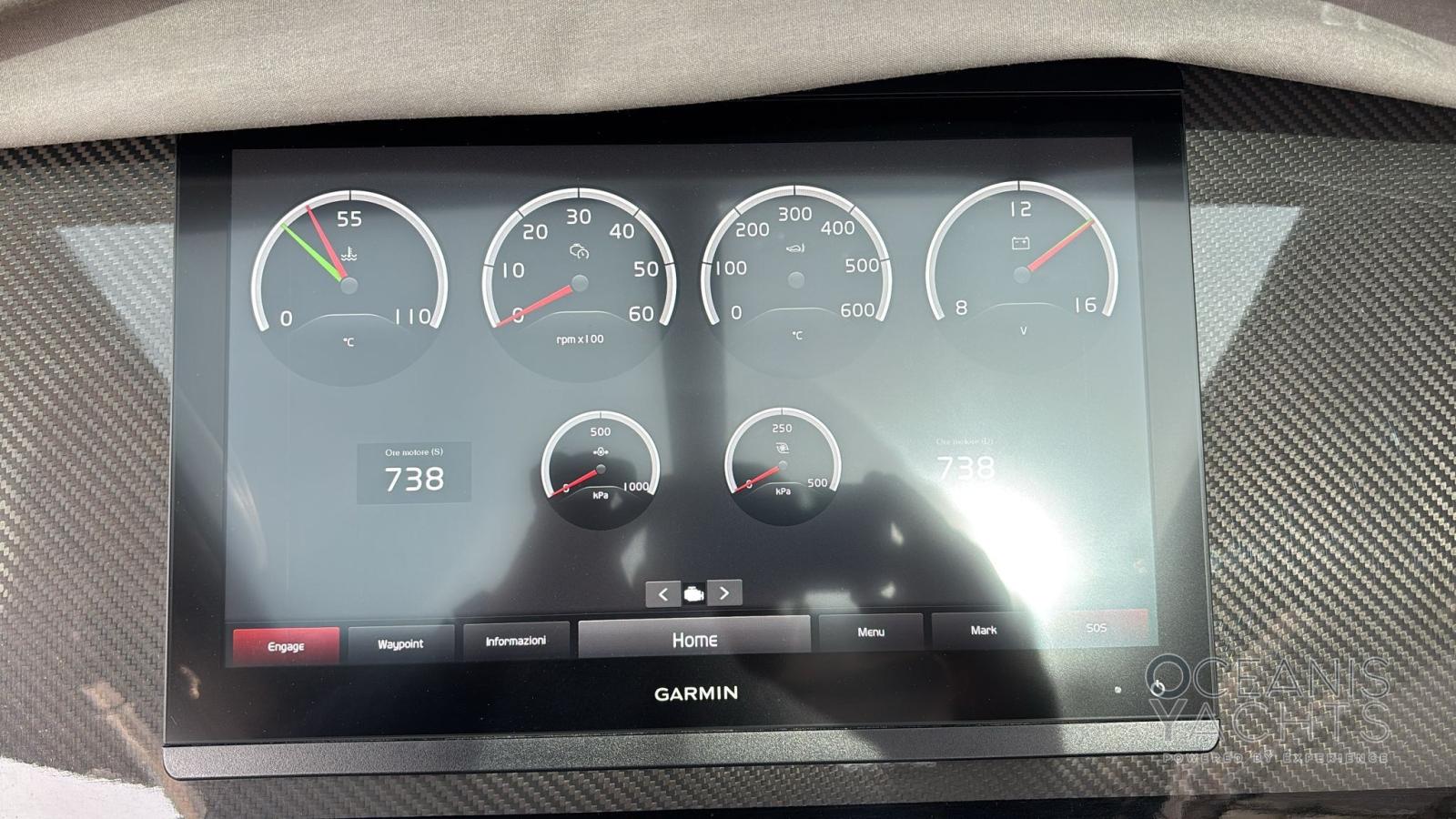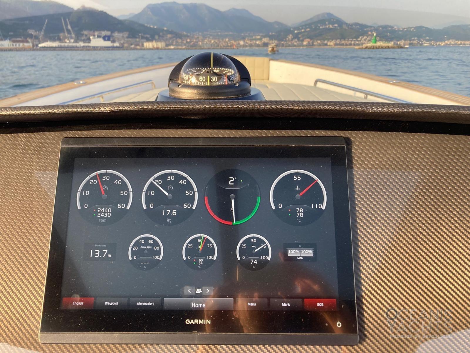 Auto Dynamic Trim Interceptor, Teak Side Decks, Deck Shower, Tender Garage, Washbasin in the cockpit, Courtesy Lights, Underwater lights, Fenders, Gangway, Teak deck, Teak Cockpit, Shorepower connector, Water harbor connector system, swimming ladder, Stabilizers, cockpit table, guard rails with gates, Horn, T-Top.