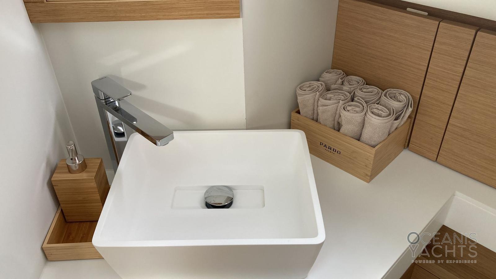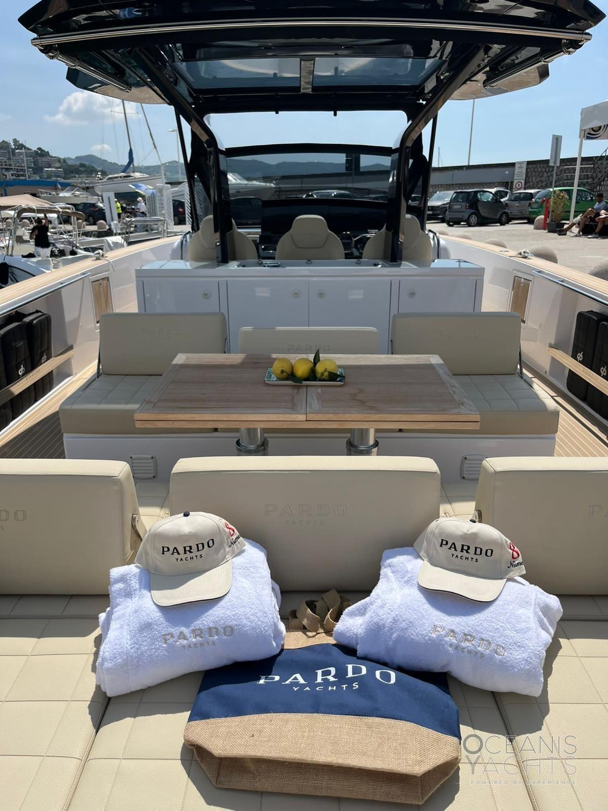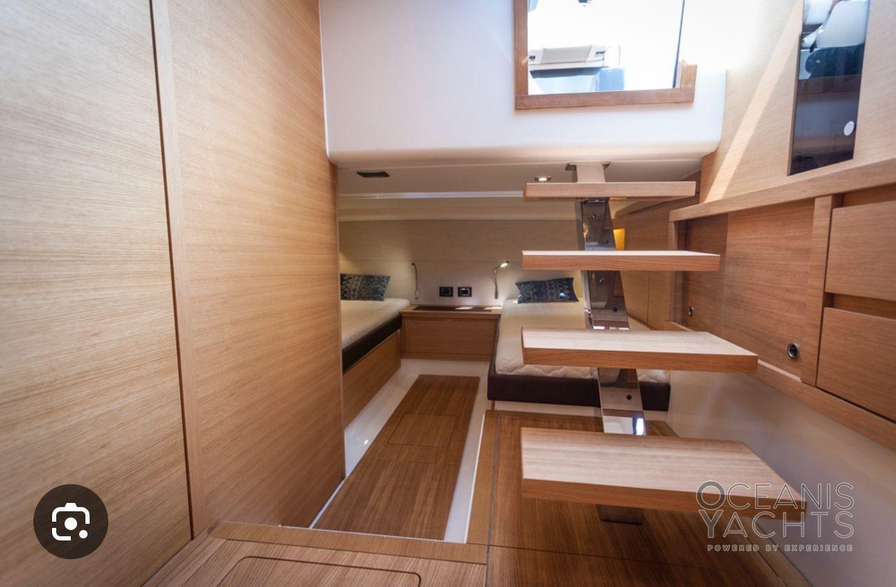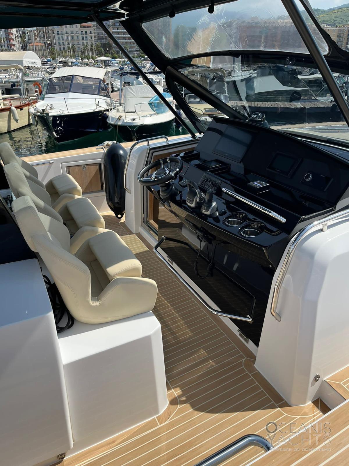 Auto Dynamic Trim Interceptor, Teak Side Decks, Deck Shower, Tender Garage, Washbasin in the cockpit, Courtesy Lights, Underwater lights, Fenders, Gangway, Teak deck, Teak Cockpit, Shorepower connector, Water harbor connector system, swimming ladder, Stabilizers, cockpit table, guard rails with gates, Horn, T-Top.