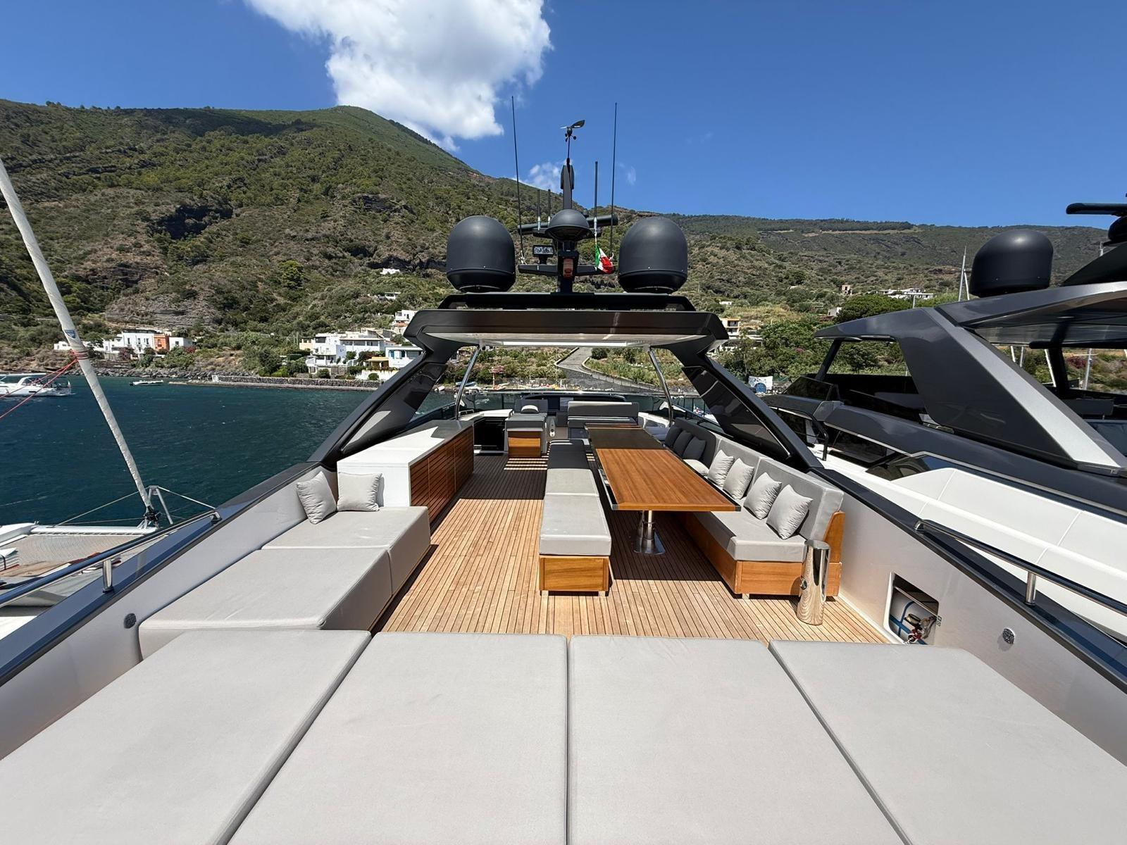 The Sanlorenzo SL86 is a boat of 26.76 m in length and with interior volumes of 90 GT. Interior and exterior design by Officina Italiana Design (Mauro Micheli). Refitting works have been carried out on the flybridge and in the guest rooms which are all equipped with a double bed: number of guests on board 8. Three crew quarters in 2 cabins.