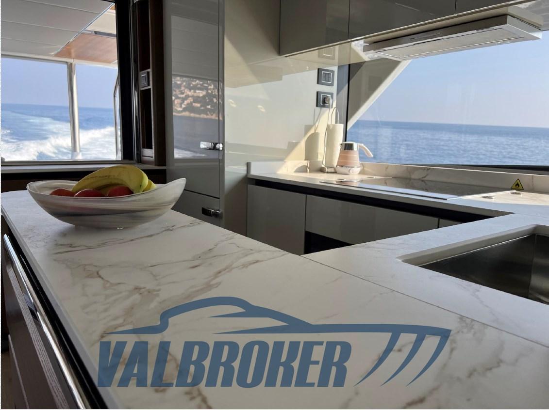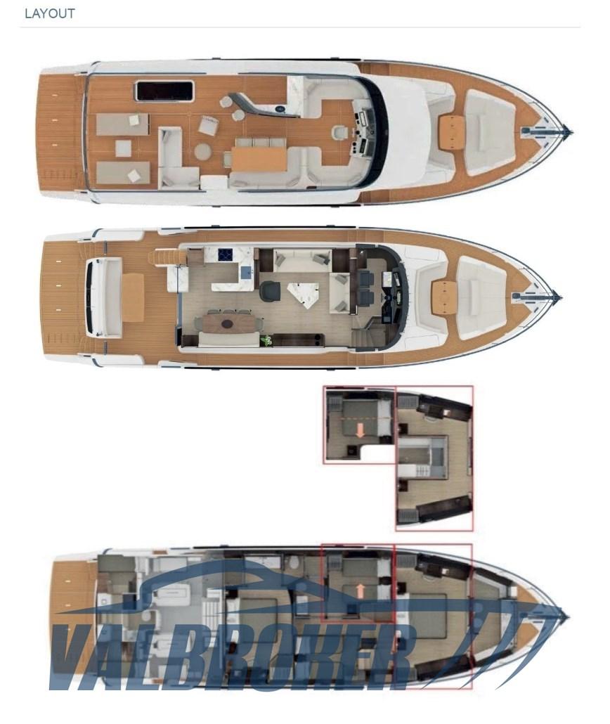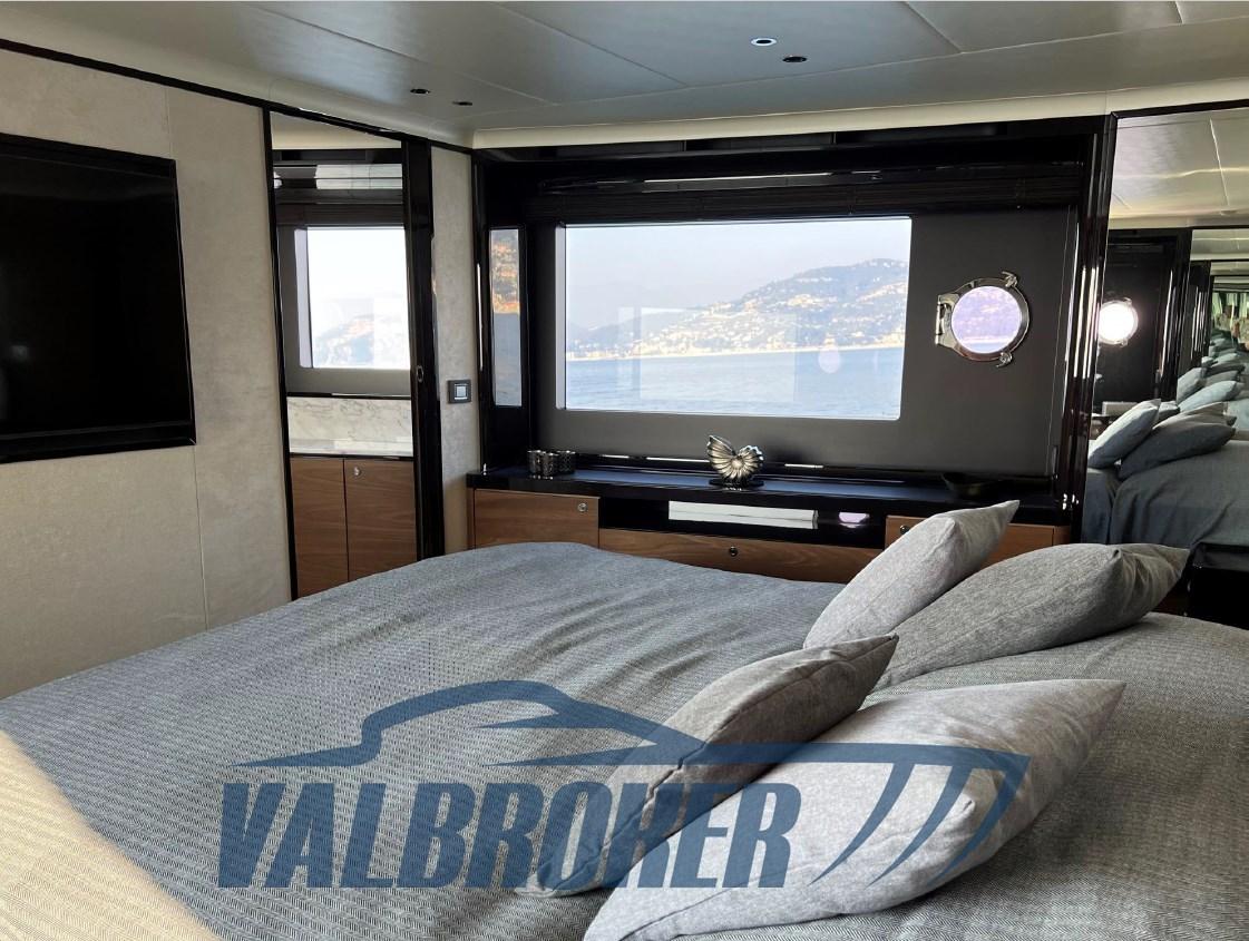 Sofa and bow sundeck shade with carbon poles, complete cover kit, teak bow table with electric leg, cover and backrest for sundeck, fly closing sheets, stern shade awning with carbon poles, Shore cable reels, gray water tank, electric blinds, Luxury interiors