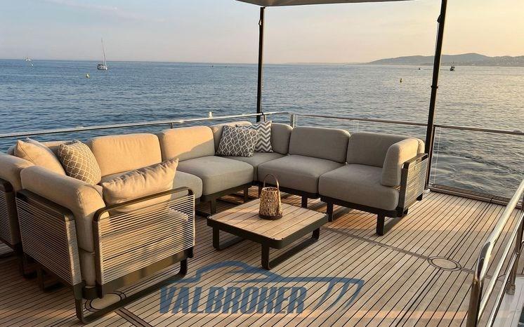 Anchor (inox ultra con catena80kg), Water pressure pump, Teak Side Decks, Deck Shower, Directional Spotlight (doppio comando), Hard top (soft top vetroresina bianco), Courtesy Lights, Underwater lights, Gangway (elettroidraulica a scomparsa, teak), Platform (teak, idraulica), Teak Cockpit, Shorepower connector, swimming ladder (integrata alla piattaforma), cockpit table (con copertura).