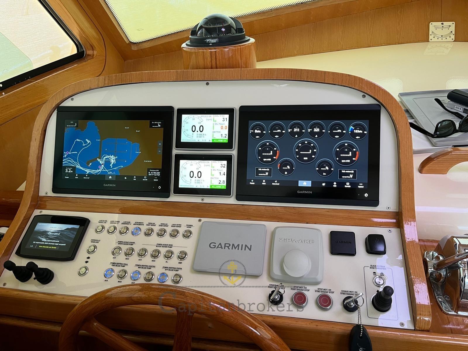 Engine Alarm, Bilge Alarm, Auto Dynamic Trim Interceptor (Zipwake), Water pressure pump, 9 Batteries (4 servizi, 4 motori, 1 elica di prua nuove 2025), Deck Shower, Washbasin in the cockpit, Gangway, Platform (in teak), Automatic Bilge Pump, Manual Bilge Pump, Entry door, Teak Cockpit, Shorepower connector, Water harbor connector system, Electric Windlass, swimming ladder, cockpit table, Horn.