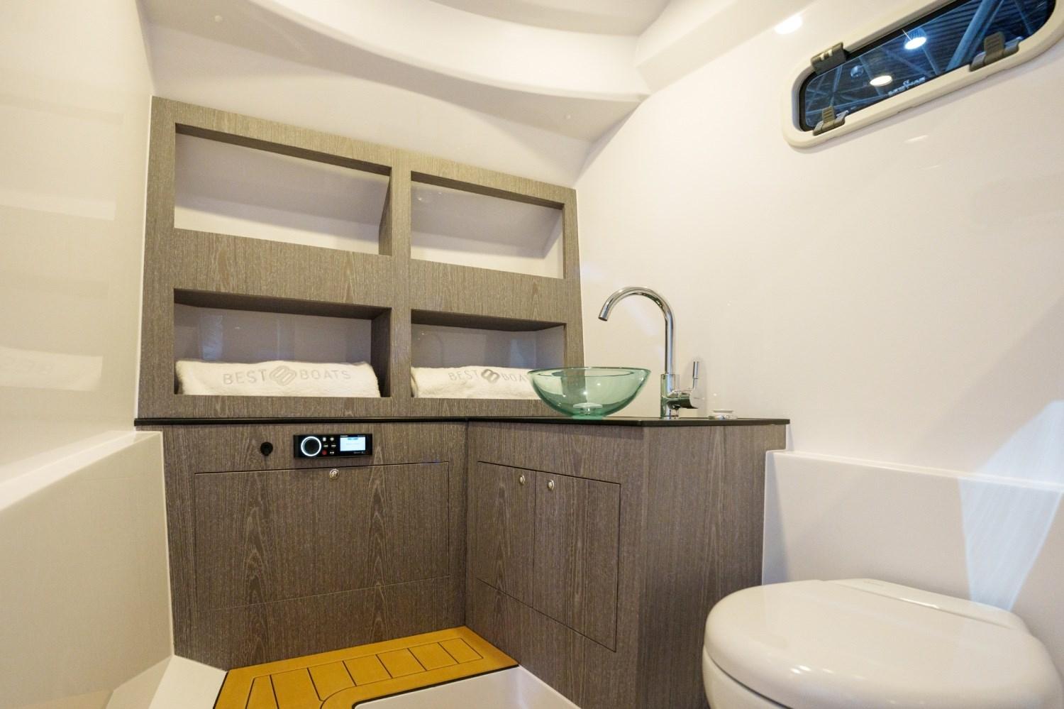 Grey HI GRIP DECK synthetic teak deck with black joints, 12/220V inverter, 220V shore socket with battery charger, Refrigerator and sink in the cockpit, Stern technical compartment with electric opening, White engine grille painting for the couple, T-top in stainless steel and canvas, Extra seat in front of the stern, Bow sundeck, Tilting backrest aft sundeck, folding teak table, Complete set of cushion covers, Underwater LED lights, Custom tubular color, Custom cushion color, Tow plates x 2, Contactless mobile phone charger on the bridge, Carbon flagpole, Carbon boat hook, Stereo system with speakers, 12" GPS with cartography, echo sounder and digital home automation utility management system, VHF, Electric winch remote control and chain counter on the bridge, 50-meter stainless steel anchor and chain, black stern awning with shading net with carbon poles, retractable cleats, stern shower, bilge pumps, 12V fixed tubular inflator, retractable swim ladder, safety equipment