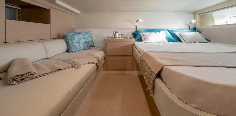 - Cabins: 3 (front cabin + 2 aft cabins)