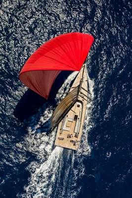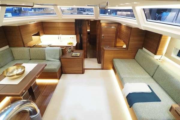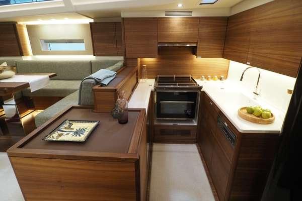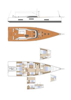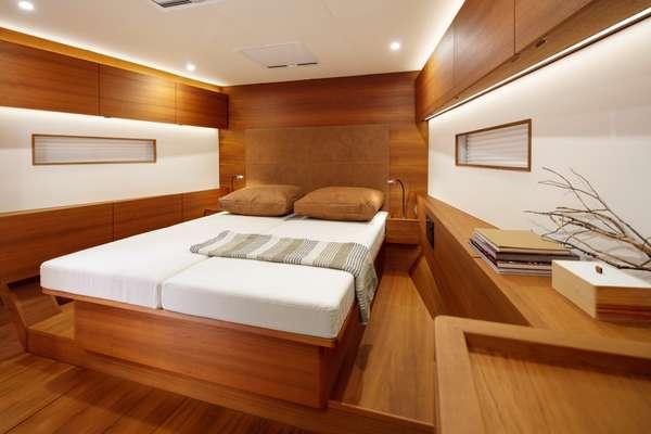 The innovation begins in the interior layout, which includes a sail locker at the front that can be used as a crew cabin with a separate bathroom. The forward cabin, very large and with plenty of storage space, can accommodate a central or side bed. The kitchen is near the mast. The large saloon is characterized by the starboard descent, which means there is only one corridor for the two aft cabins. Each cabin has its own bathroom with shower. The 3-meter tender garage has longitudinal access, not affecting the volume of the aft cabins. The offset starboard descent also allows for a very large cockpit with a large table convertible into a sunbathing area to port and a passage to starboard, before the cockpit benches. At the rear of the cockpit is the work area with a central winch for the mainsail sheet and two others on the side.
