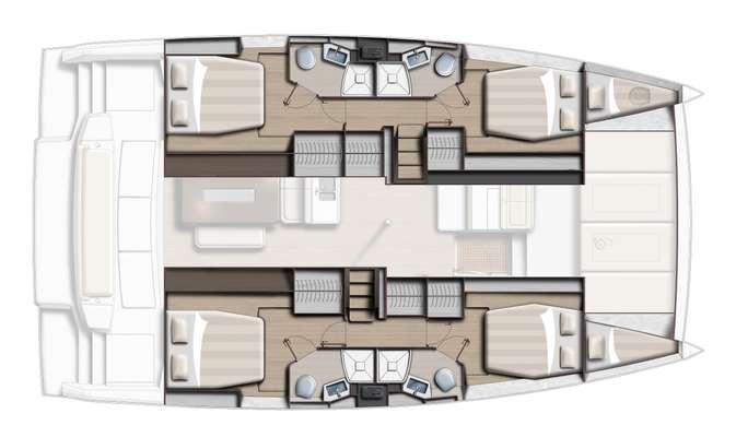 This high-end model offers **95 m² of living space**, designed for life on board during cruises. Its **Open Space** layout, designed by Piaton&Bercault, includes a U-shaped kitchen, a large saloon for 10 people, a huge sofa, and generous volumes for smooth and pleasant circulation.