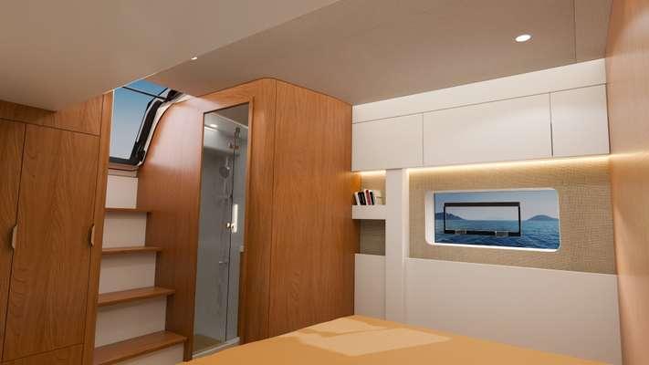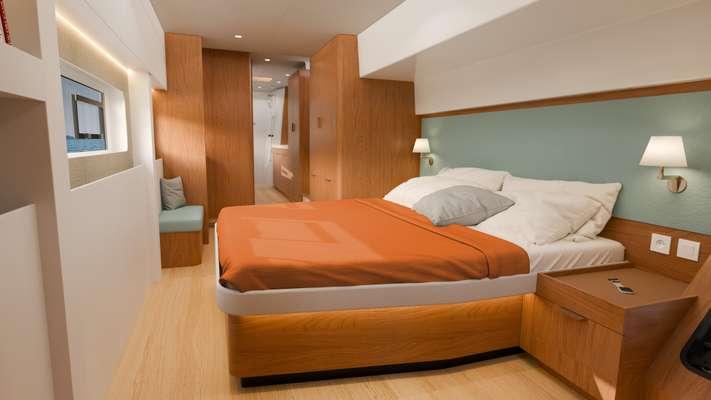 The BALI 5.2 stands out for its exceptional modularity, accommodating up to 16 berths. Available in configurations of 3, 4, 5, or 6 cabins, it is the first catamaran in its category to offer such a diversity of layouts. The large U-shaped kitchen with high cabinets maximizes storage. The chart table integrates connected equipment management and also serves as a desk facing the sea. The saloon impresses with its XXL table for 12 guests, a large L-shaped bench, and a lounge area ideal for relaxation.