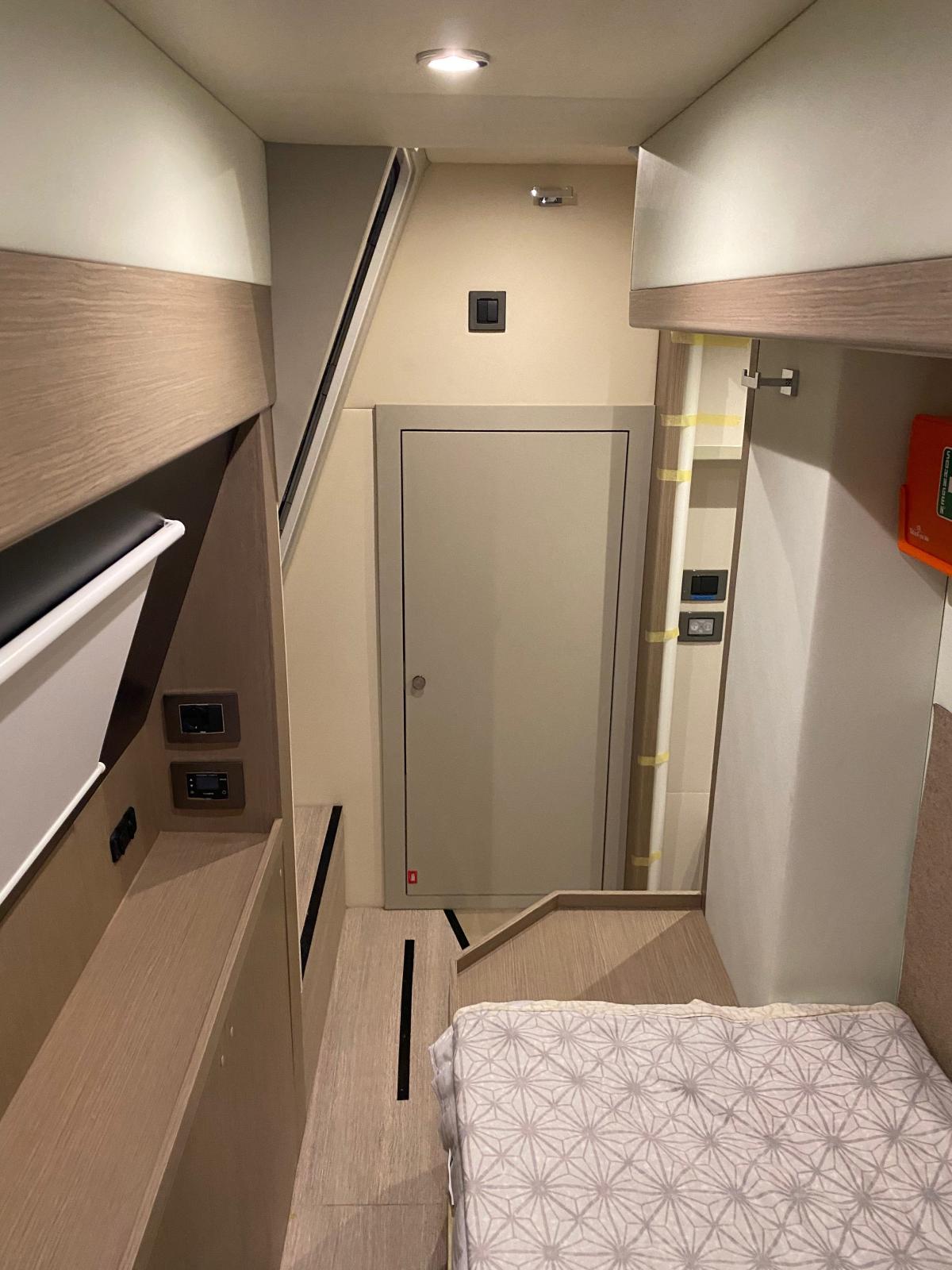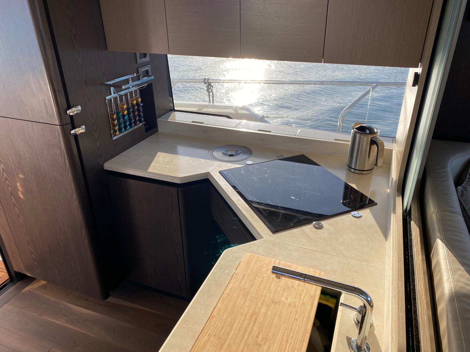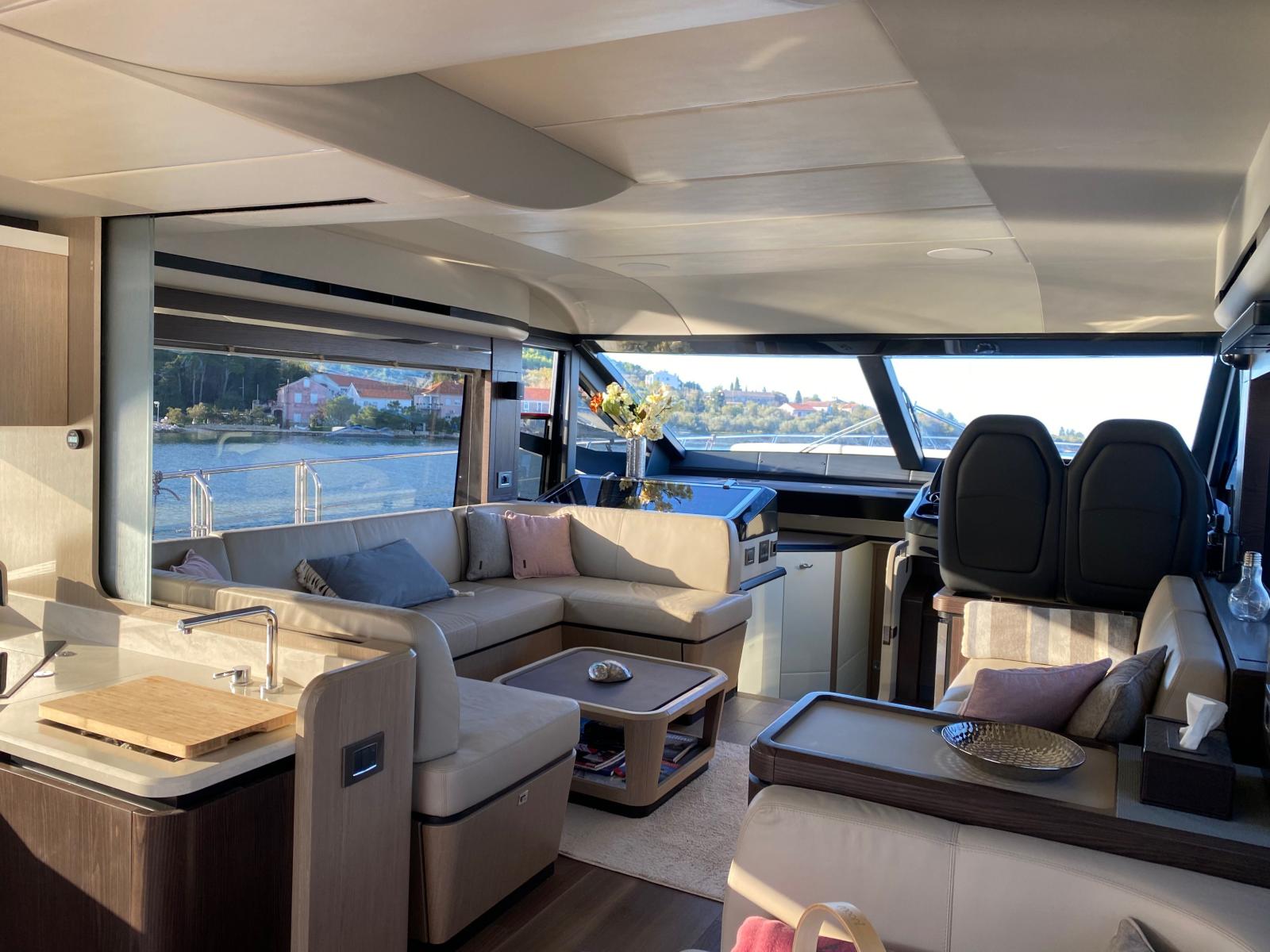 This model also stands out for its particularly generous living spaces: a spacious and light-filled saloon, galley open to the cockpit, an immense flybridge among the largest in her category, as well as beautiful relaxation areas both forward and aft.
