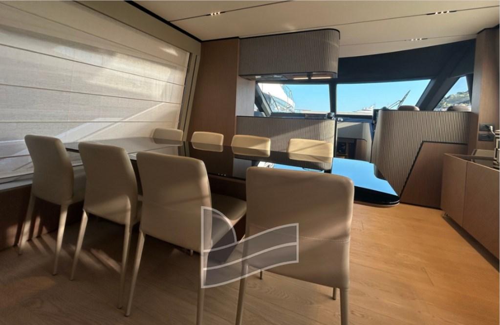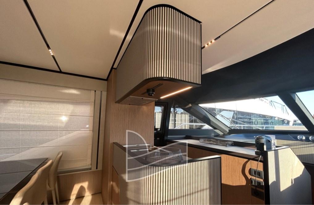 The main deck develops as an open and continuous environment, where the saloon welcomes with generous volumes and a perception of space typical of larger yachts. The floor-to-ceiling side windows offer a constant panoramic view, creating a direct dialogue with the sea.