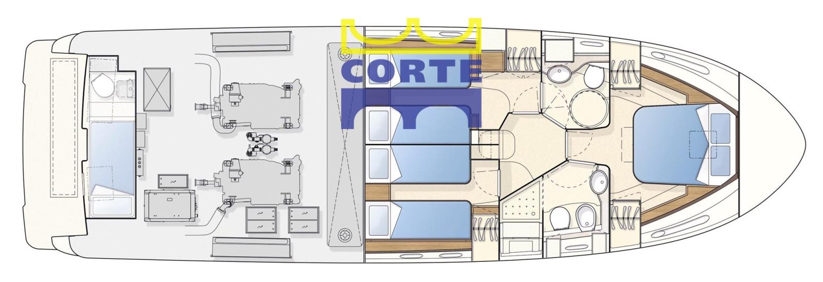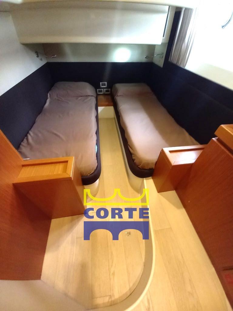 Double master cabin in the bow, two cabins with single beds, two bathrooms. Crew cabin with bathroom, currently with washing machine and watermaker