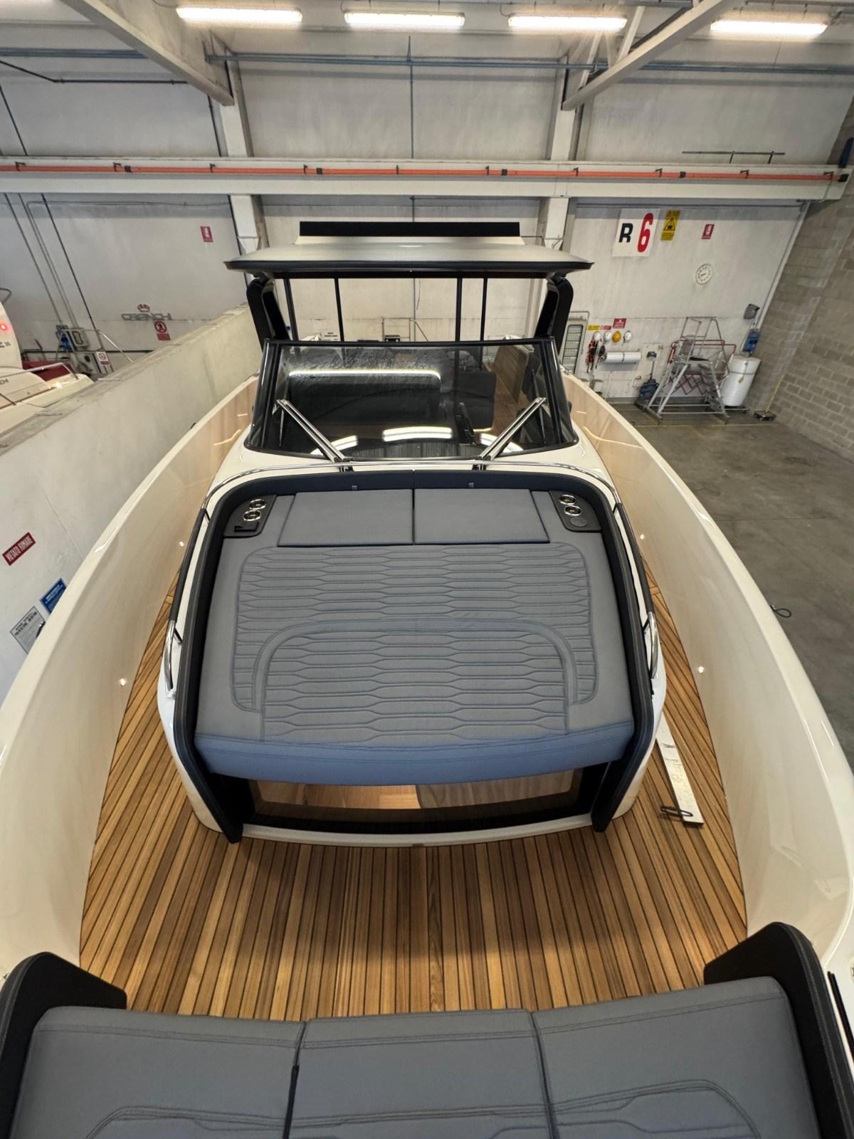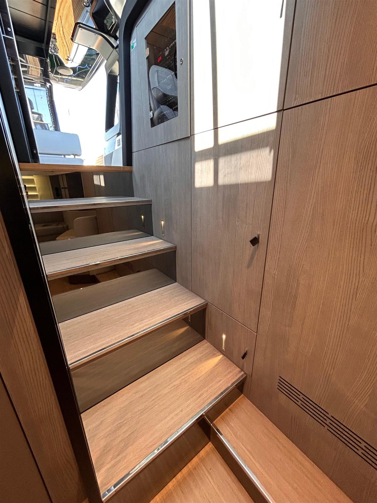 Engine Alarm, Anchor (Ancora digitale Volvo Penta DPS + ASSISTED DOCKING), Water pressure pump, Teak Side Decks, Deck Shower, Bow Thruster (con estintore automatico), Directional Spotlight, Hydraulic Flaps, Gangway (IDRAULICA A 3 STADI L m 3), Platform (a idraulica Sali/scendi 28 cm sotto acqua e portata kg 130), Automatic Bilge Pump, Electric Windlass, swimming ladder, Stabilizers (Correttori d'assetto "Active+ Stabilization, List & Coordinated Turn package" (Dynamic Plus Package)), cockpit table, Bow Winches (Campana di tonneggio a prua, a scomparsa).