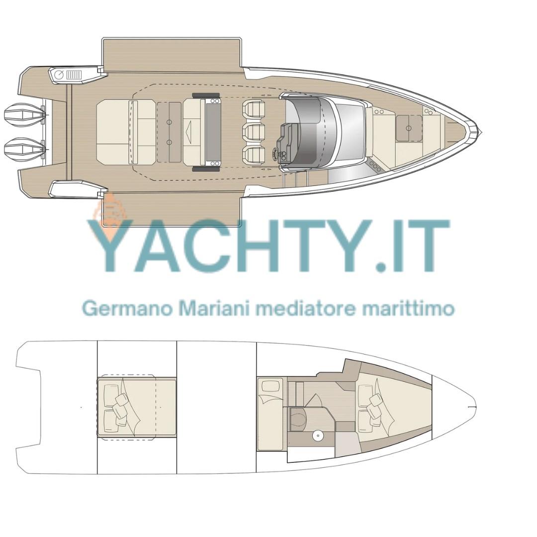 Powered by 2 x Mercury V10 350 hp Black, it guarantees prompt acceleration and precise handling, supported by the latest generation instrumentation with 16" Simrad NSS4 display, GPS, echo sounder and VHF. The cockpit is a real lounge on the water, enhanced by a teak cockpit, folding tables (saloon with electric leg), courtesy lights as well as underwater lights that transform the evening mooring into a scenic moment.