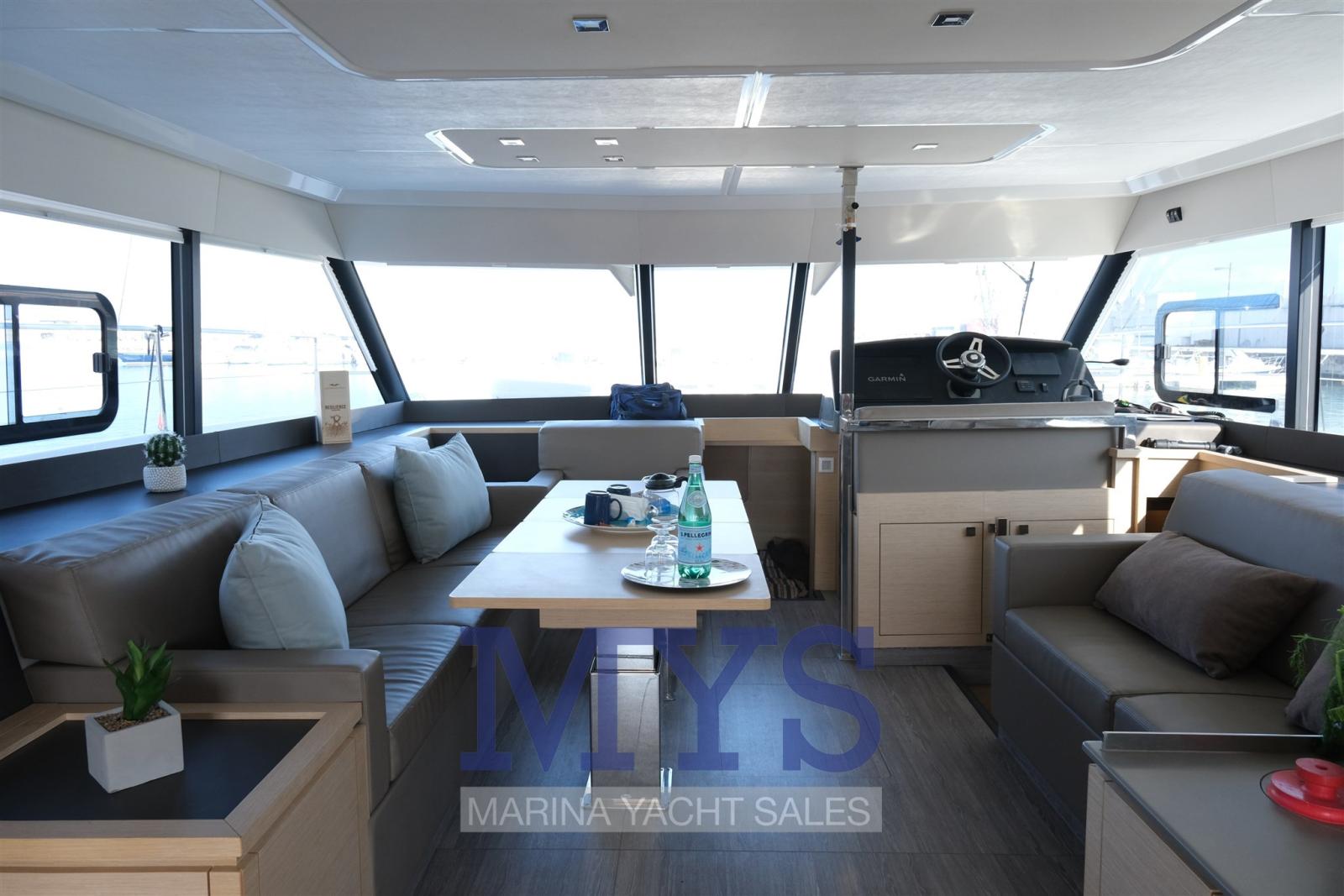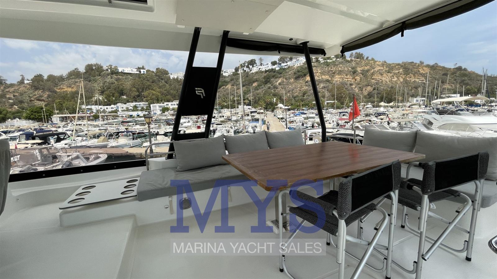Engine Alarm, Water pressure pump, Deck Shower, Twin Steering, Directional Spotlight, Hydraulic Flaps, Fire Extinguishing System, Flaps Indicators, Courtesy Lights, Solar panels, Gangway, Platform, Automatic Bilge Pump, Entry door, Teak Cockpit, Shorepower connector, Water harbor connector system, Electric Windlass, swimming ladder, Saddles for tender, cockpit table, Horn, T-Top, Stern Winches.