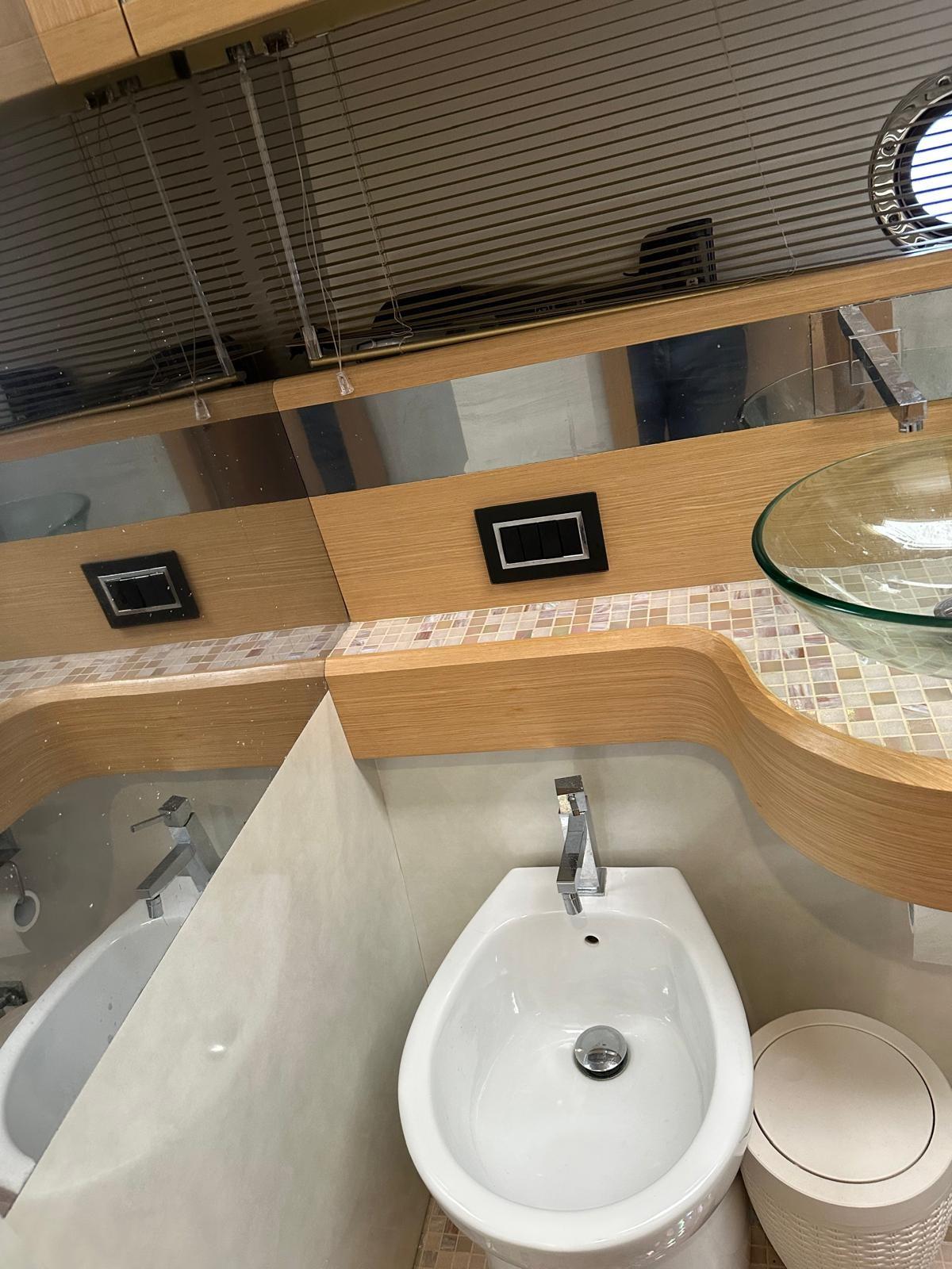Engine Alarm, Bilge Alarm, Alternator, Electric Engine Compartment Opening, Water pressure pump, Special Colour (CARTA ZUCCHERO CANGIANTE), Deck Shower, Directional Spotlight, Electric Flaps, Hard top, Fire Extinguishing System, Courtesy Lights, Gangway, Platform, Automatic Bilge Pump, Manual Bilge Pump, Entry door, Teak Cockpit, Shorepower connector, Electric Windlass, swimming ladder, cockpit table (ELETTRICO A SCOMPARSA), guard rails with gates, Horn, Stern Winches.