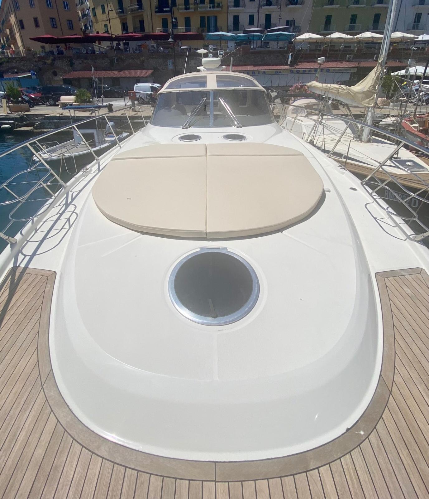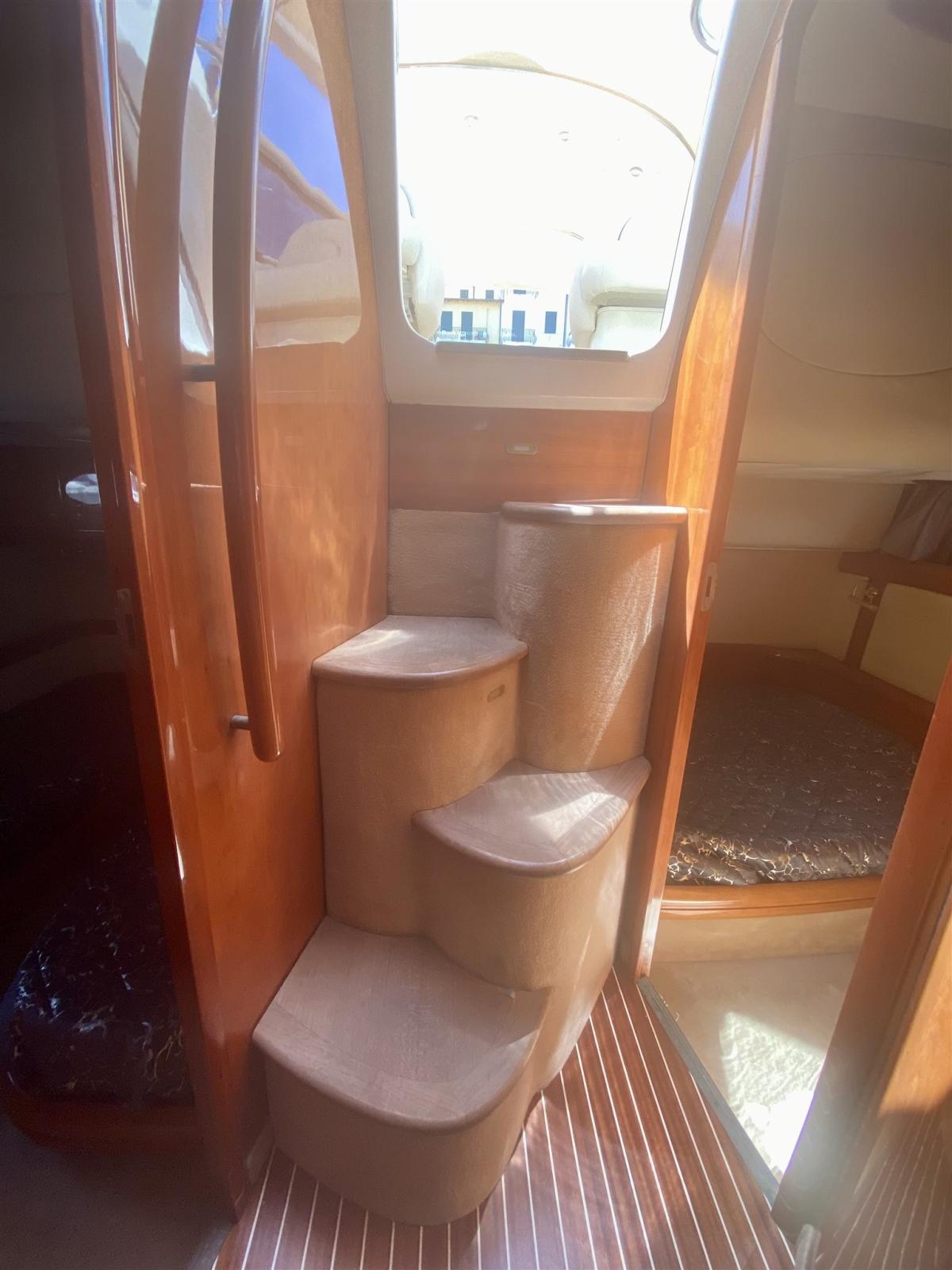 Engine Alarm, Bilge Alarm, Alternator, Water pressure pump, Shore power cable, Special Colour (SCAFO BLU), Deck Shower, Directional Spotlight, Hydraulic Flaps, Tender Garage, Fire Extinguishing System, Washbasin in the cockpit, Courtesy Lights, Gangway, Platform, Automatic Bilge Pump, Manual Bilge Pump, Teak Cockpit, Shorepower connector, Rollbar, Electric Windlass, swimming ladder, cockpit table, guard rails with gates, Horn, Stern Winches.